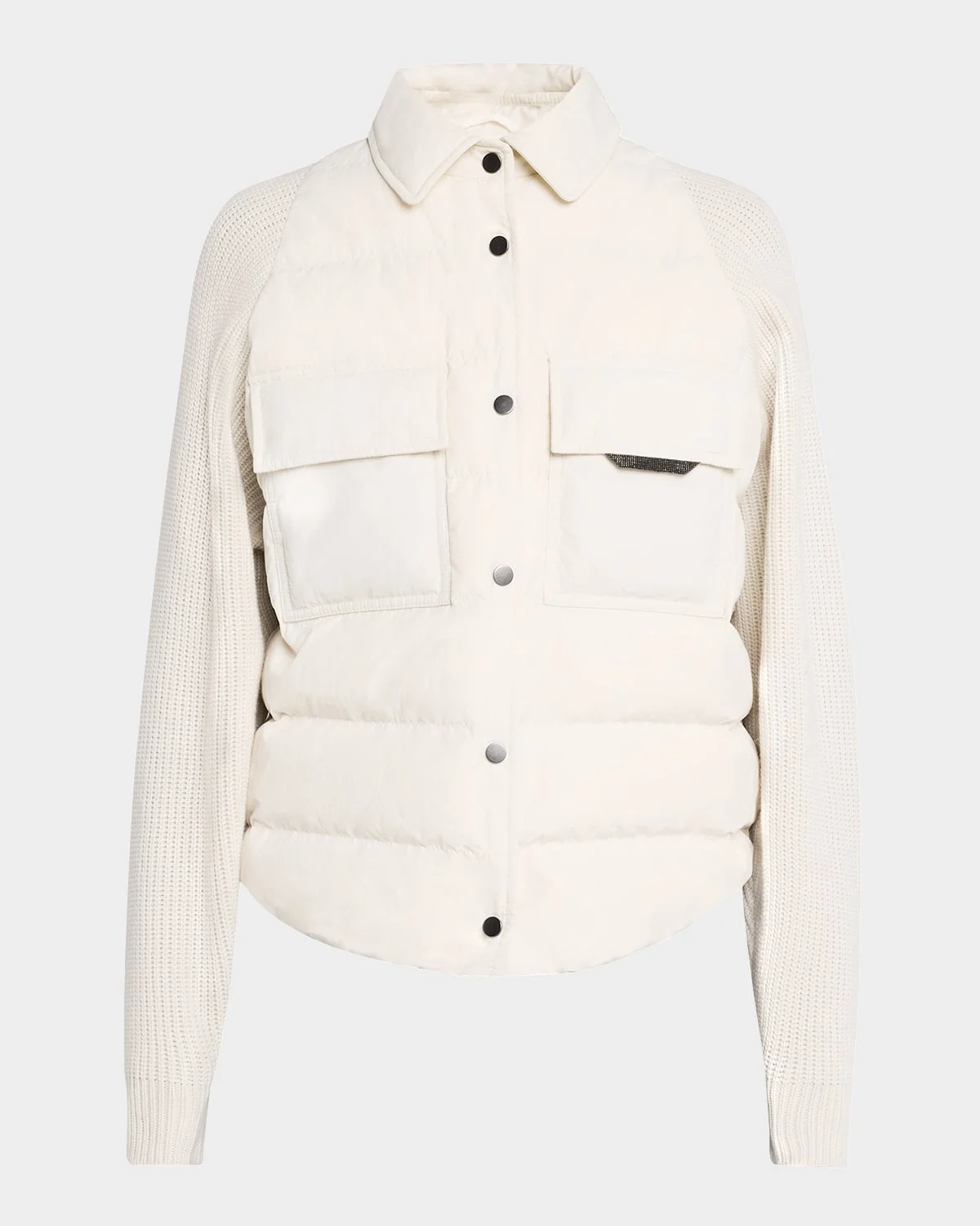 - Brunello Cucinelli padded jacket in quilted crinkle cotton techno and knit sleeves with a monili trimmed pocket - Point collar; snap front - Long raglan sleeves; ribbed cuffs - Chest flap pockets - Straight fit - Hip length - Nylon/polyamide/cotton - Fill: polyester - Made in Italy