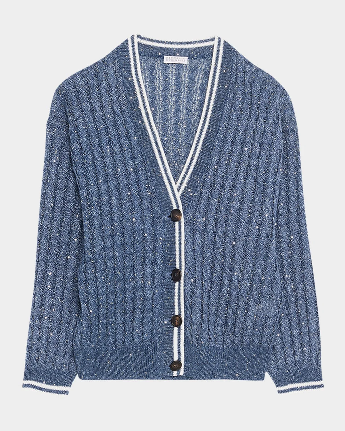 Crafted from breathable openwork cable knit, this cardigan from Brunello Cucinelli features fine paillettes that spread & nbsp;delicate, shiny reflections throughout and is trimmed with contrast striped ribbed edges V neckline; button front Long sleeves Drop shoulders Loose fit Hip length Ribbed cuffs and hem Linen/nylon/polyamide/cotton Dry clean Made in Italy SIZE & FITModel measurements: 5 & apos;10" tallModel is wearing a US size 4/Small