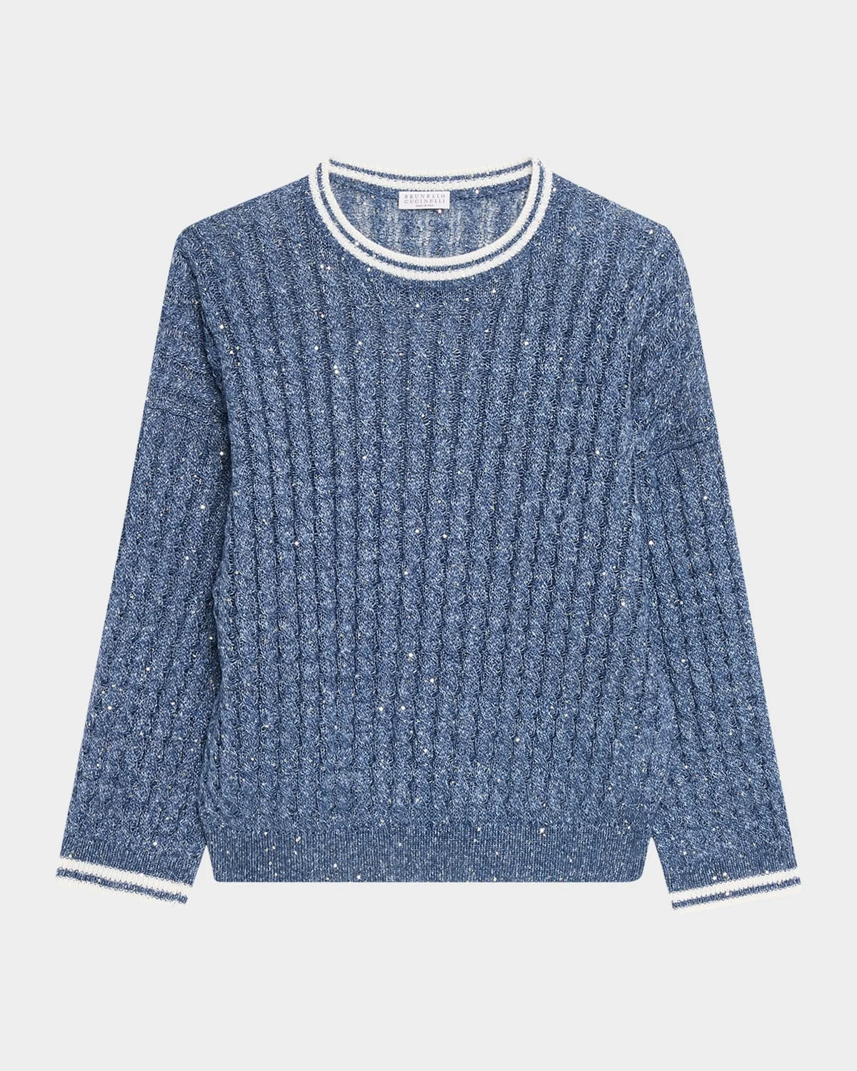 Crafted from breathable openwork cable knit, this sweater from Brunello Cucinelli features fine paillettes that spread & nbsp;delicate, shiny reflections throughout and is trimmed with contrast striped ribbed edges Crew neckline Long sleeves Drop shoulders Loose fit Hip length Ribbed cuffs and hem Pullover style Linen/nylon/polyamide/cotton Dry clean Made in Italy SIZE & FITModel measurements: 5 & apos;10" tallModel is wearing a US size 4/Small