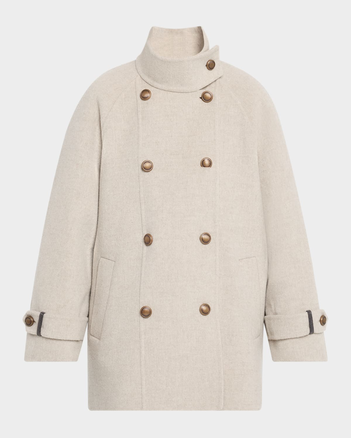 - Brunello Cucinelli "Melton" coat featuring monili cuff belt loops - Stand collar; double-breasted front - Long raglan sleeves; button-tab cuffs - Hip welt pockets - Straight fit - Hem falls below the hip - Virgin wool/cashmere - Made in Italy