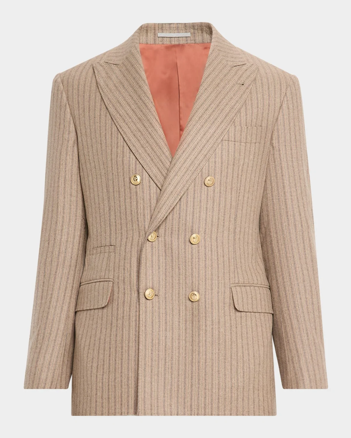 Deconstructed Brunello Cucinelli blazer, rendered in the finest cashmere and silk flannel, with a slender striped pattern and pronounced shoulders, finished with signature golden buttons Notched lapel; oneandahalfbreasted front with metal buttons Flap waist pockets, ticket pocket, and chest pocket Interior buttoned pockets and pen holder Iconic buttons accent the cuffs Double back vent Cupro lining Cashmere/silk Lining: Cupro Professional cleaning recommended Made in Italy