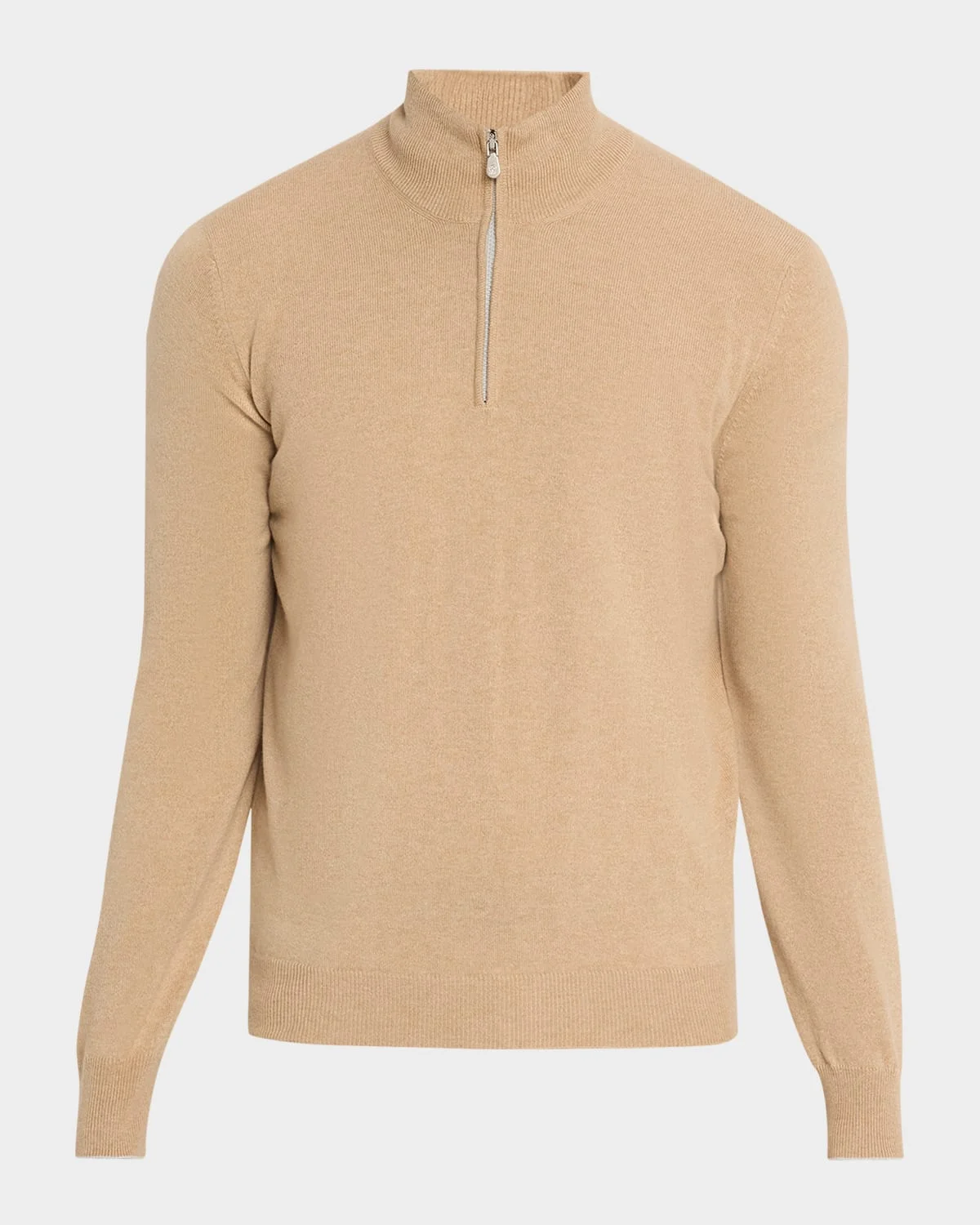 The naturally soft qualities of premium cashmere, paired with expert workmanship, enrich the casual style of this sweater from Brunello Cucinelli. Ribbed mock neck Quarterzip front Ribbed cuffs and hem Pullover style Cashmere Dry clean Made in Italy