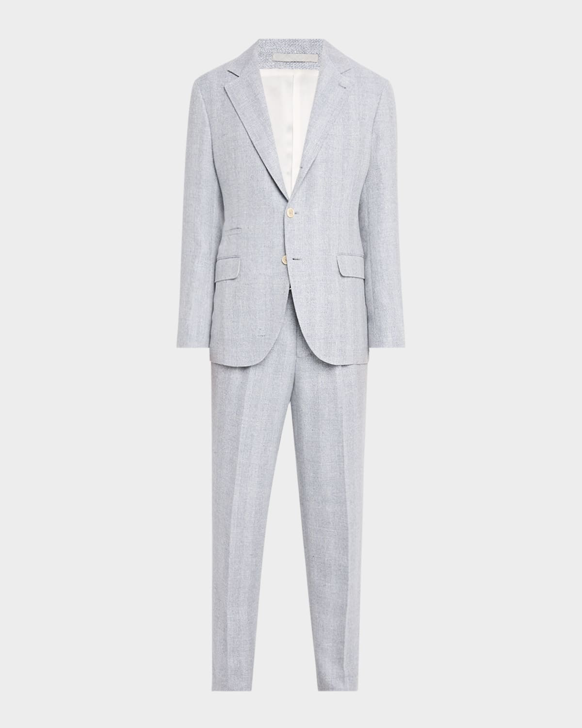 - Brunello Cucinelli "Cavallo" two-piece suit in textured chevron - Modern fit - Linen/silk/wool - Lining: Acetate/cotton/cupro/viscose - Dry clean - Made in Italy - Jacket: - Notched lapels - Single-breasted front - Barchetta chest pocket - Hip flap pockets; ticket pocket - Double-vented back - Trousers: - Regular rise - Single-pleated front - Side slip pockets - Straight legs