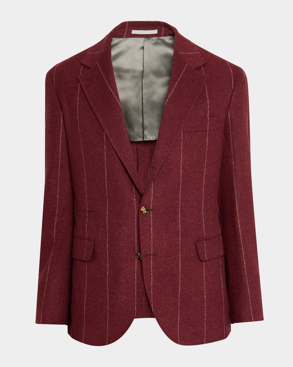 Brunello Cucinelli chalk stripe flannel blazer finished with four horn buttons on the cuffs Notched lapels Long sleeves Two interior pockets with button closure Welt flap pockets Double back vent Midlength Classic fit Singlebreasted button closure Silk/wool/cashmere Lining: Cupro Dry clean Made in Italy
