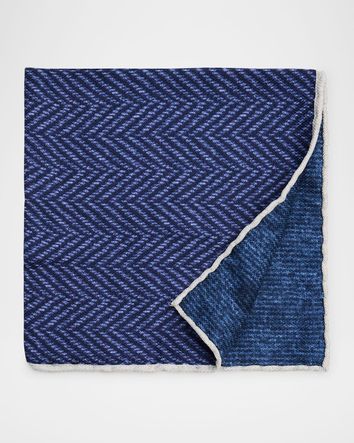 - Brunello Cucinelli double-faced pocket square showcasing a tonal chevron print - Subtle stripe pattern on the reverse side - Contrast trim - May be styled multiple ways - Silk - Hand wash or dry clean - Made in Italy