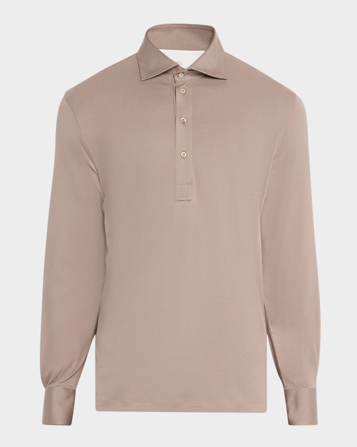 - Brunello Cucinelli polo shirt in breathable cotton for all-day wear - Spread collar - Four-button placket - Long sleeves - Round barrel cuffs - Vented sides - Pullover style - Cotton - Unlined - Machine wash line dry - Made in Italy