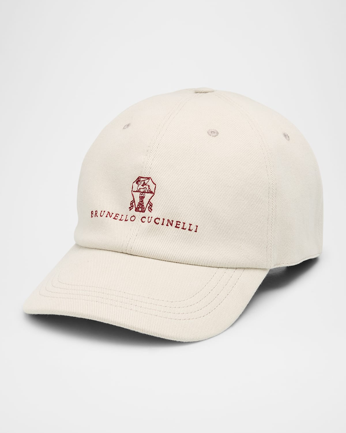 - Brunello Cucinelli baseball cap in cotton-stretch bull denim - Embroidered logo emblem on the front - Top button - Six-panel construction - Embroidered eyelets - Curved stitched brim - Adjustable leather back strap - Cotton/elastane - Made in Italy