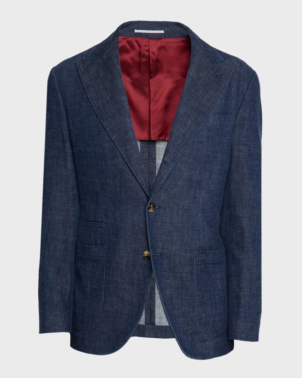 - Brunello Cucinelli sport jacket in lightweight denim for casual styling - Peak lapels - Single-breasted front - Barchetta chest pocket - Hip patch pockets; ticket pocket - Internal breast pocket - Double-vented back - Cotton - Lining: Cupro - Dry clean, machine wash line dry - Made in Italy