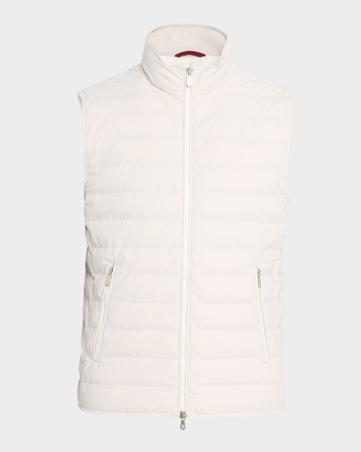 - Brunello Cucinelli vest in durable nylon with subtle quilting and contrast trim - Down/feather padded fill - Stand collar - Two-way zip front - Side zip pockets - Sleeveless - Nylon/polyamide/elastane - Lining: Nylon - Dry clean, machine wash line dry - Made in Italy
