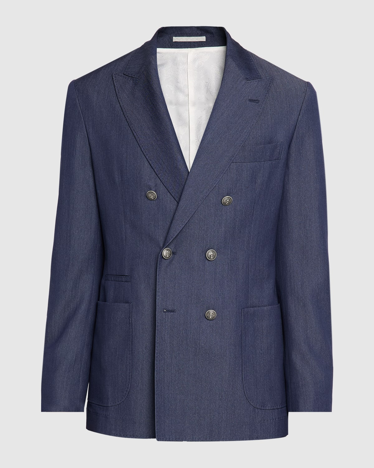 - Brunello Cucinelli sport jacket from the High Summer Capsule is crafted in a denim-effect wool-blend with buffalo horn buttons. - Peak lapels - Chest welt pocket - Double-breasted front - Patch pockets - Four-button cuffs - Virgin wool/silk - Lining: Cupro - Dry clean - Made in Italy