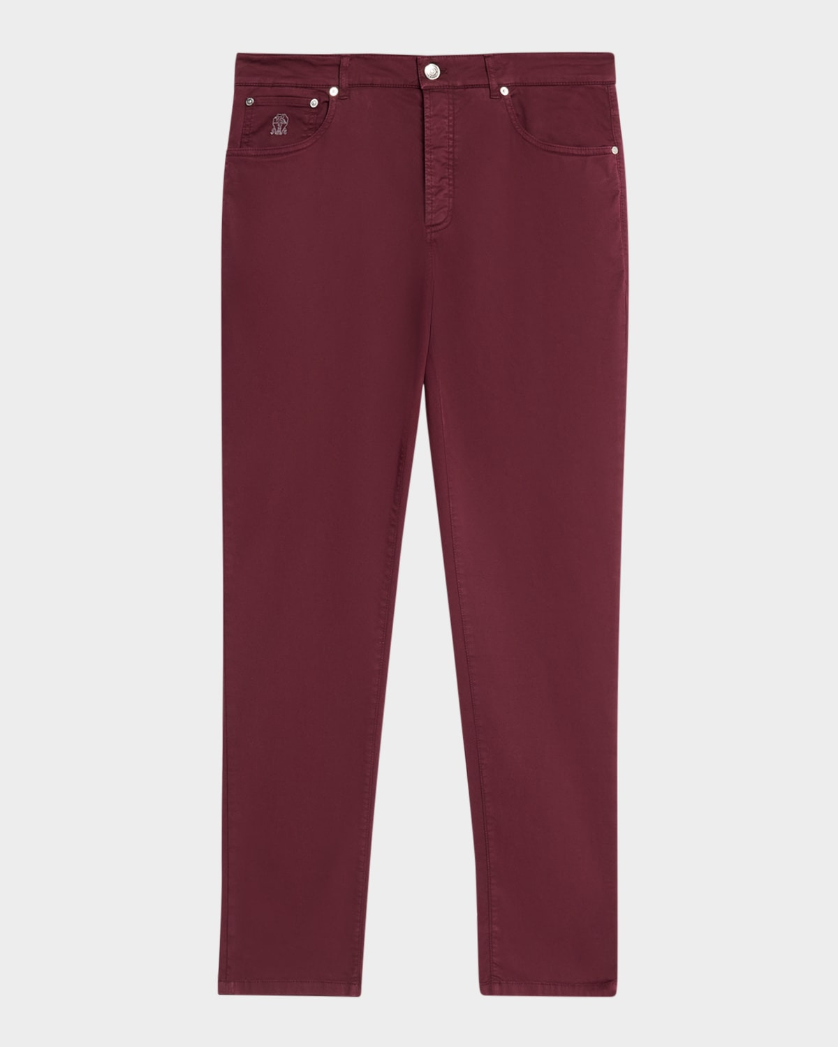 - Brunello Cucinelli pants in garment dyed denim revealed in an Italian fit - Regular rise - Flat front - Five-pocket style - Back label - Classic fit through slim legs - Full length - Button-zip front; belt loops - Cotton/elastane - Lining: Cotton/polyester - Dry clean, machine wash line dry - Made in Italy
