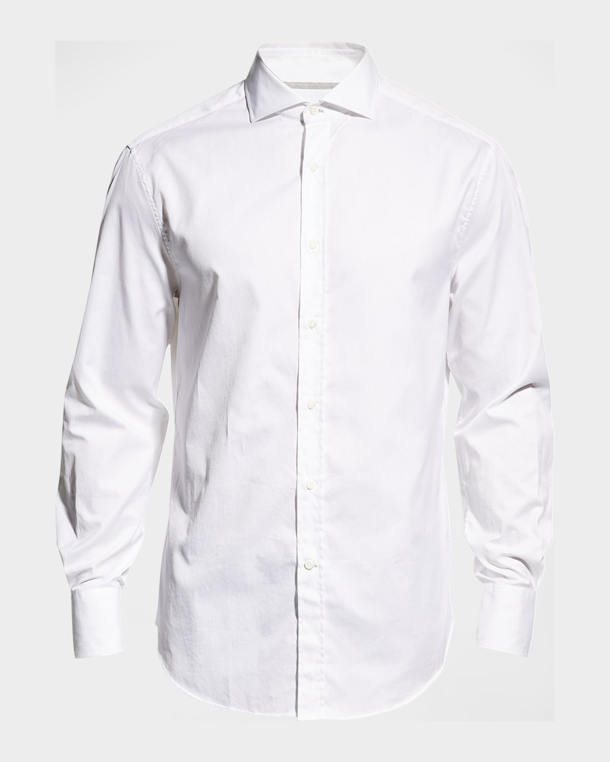 - Brunello Cucinelli sport shirt in jersey knit. - Approx. length: - 30" from shoulder to hem. - Spread collar; button front. - Rounded barrel cuffs. - Shirttail hem. - Mercerized cotton. - Machine wash. - Made in Italy. - Model is 6'1"/185cm.