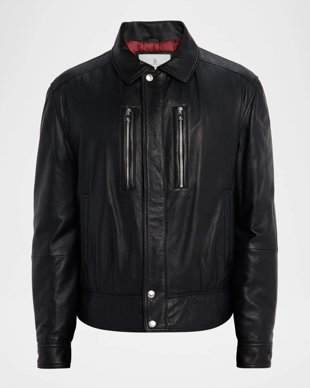 Men's Leather Full-Zip Bomber Jacket with Chest Zips