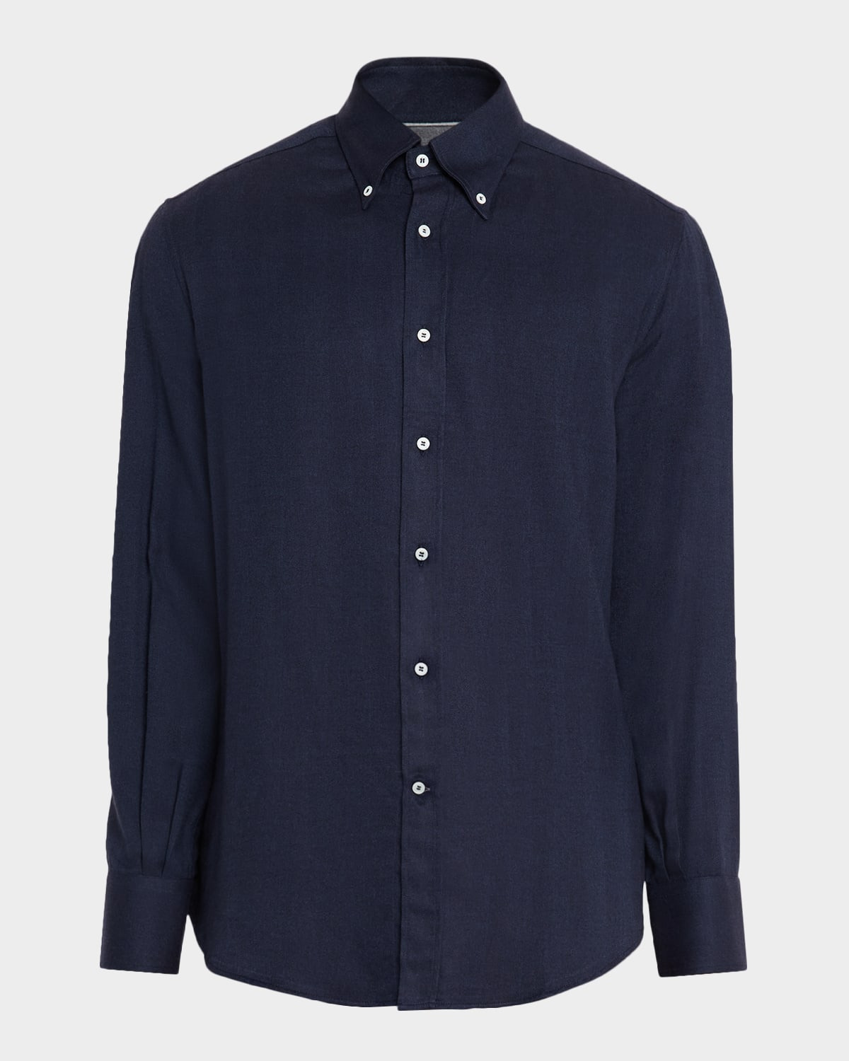 - Brunello Cucinelli sport shirt in a comfortable chevron woven cotton blend - Genuine mother-of-pearl buttons - Button-down collar - Button placket - Long sleeves - Double-button cuffs - Pleated back yoke - Curved hem - Cotton/lyocell - Lining: Cotton - Dry clean, machine wash line dry - Made in Italy