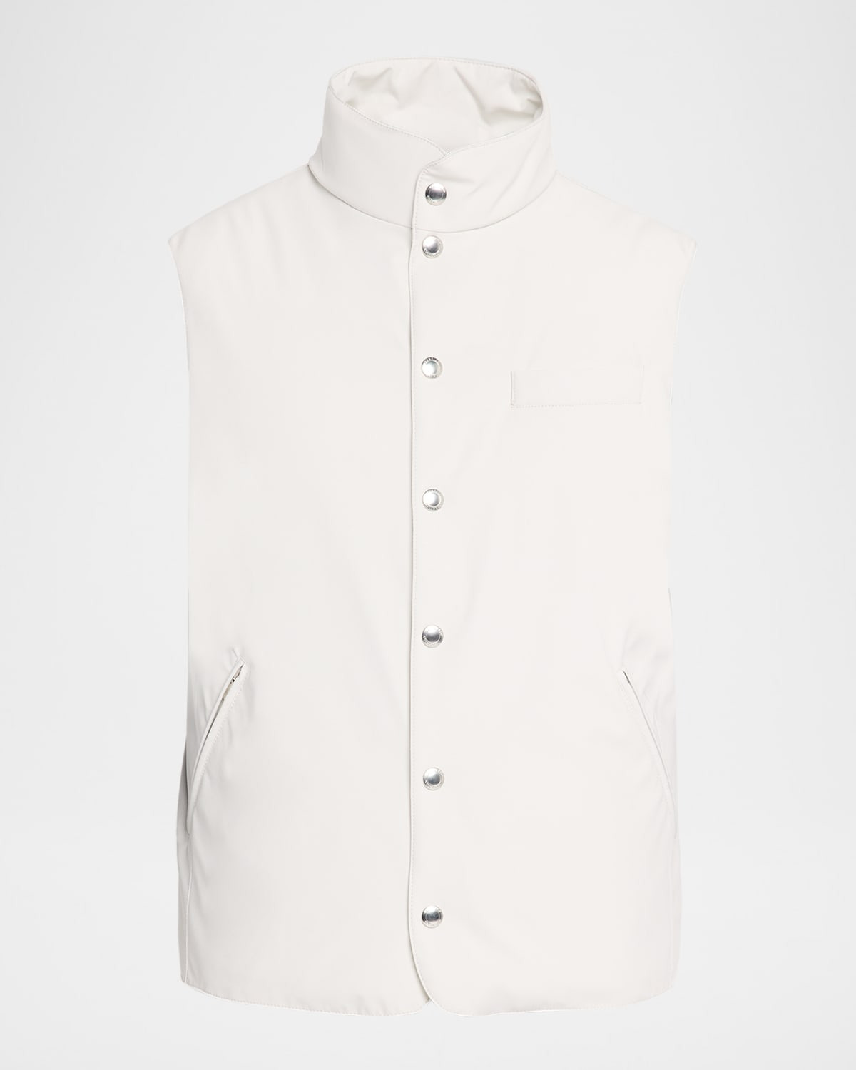 - Brunello Cucinelli vest in durable nylon with a satin finish - Down/feather padded fill - Stand collar - Snap front - Side zip pockets - Sleeveless - Curved hem - Nylon/polyamide/elastane - Lining: Cotton/nylon - Hand wash or dry clean - Made in Italy