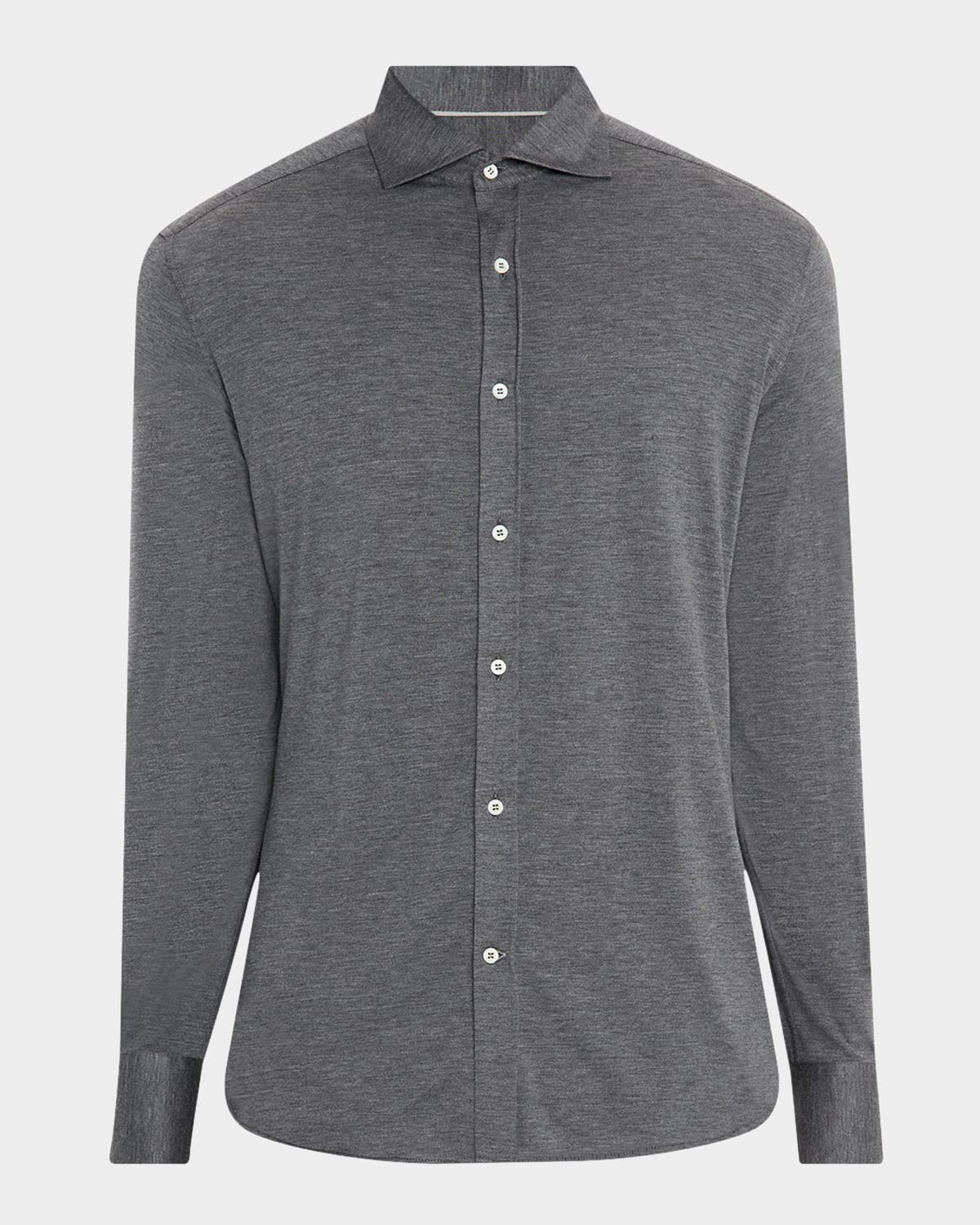 - Brunello Cucinelli sport shirt in sumptuous silk-cotton jersey for a subtle sheen - Genuine mother-of-pearl buttons - Spread collar - Button placket - Long sleeves - Double-button cuffs - Back yoke - Curved hem - Silk/cotton - Unlined - Dry clean, machine wash line dry - Made in Italy