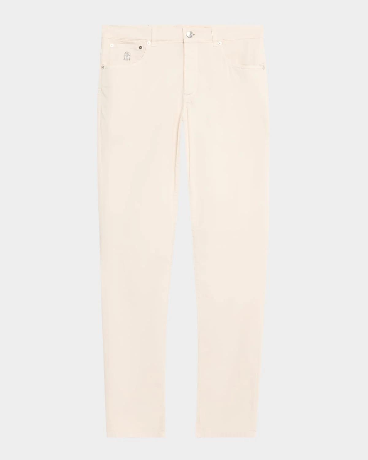 Brunello Cucinelli pants crafted from stretch cotton denim Regular rise Fivepocket style Flat front Slim, straight legs Button/zip fly; belt loops Cotton/elastane Lining: Cotton/polyester Dry clean Made in Italy