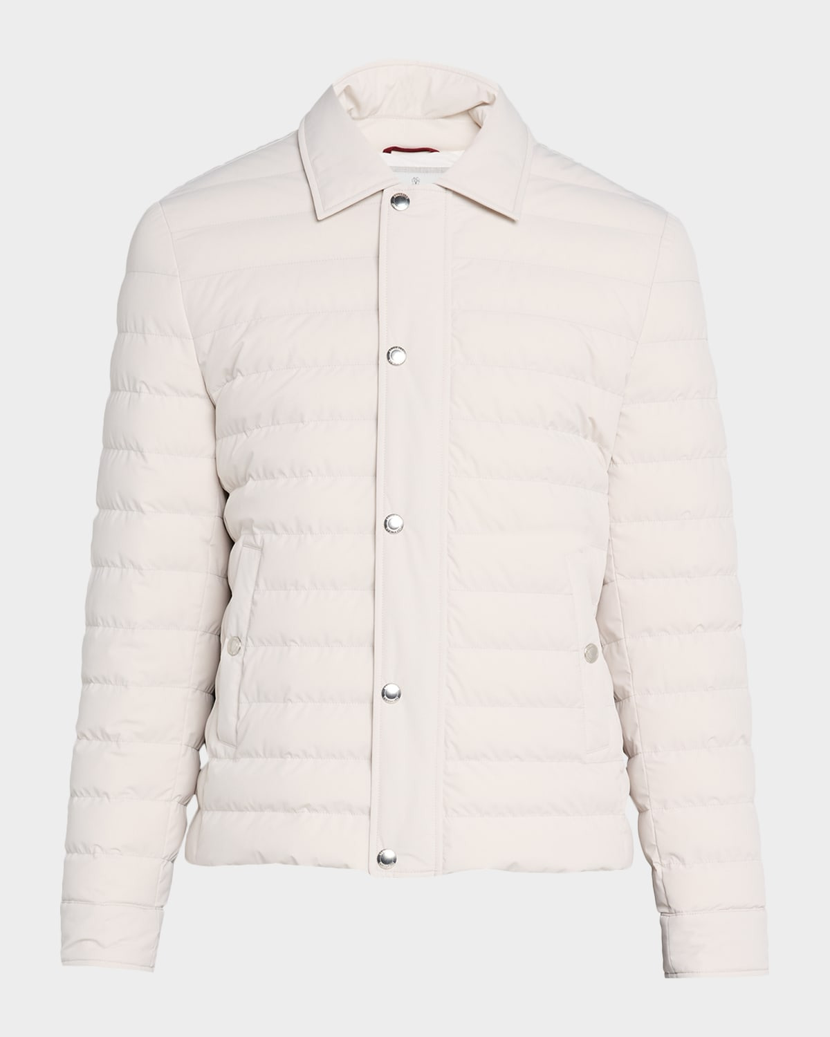 - This quilted jacket from Brunello Cucinelli stylishly provides warmth. Let the polyester and down/feather fill caress you during the low temperatures. - Point collar - Snap/zip placket - Side snap pockets - Nylon/polyamide/elastane - Lining: Nylon - Dry clean, machine wash line dry - Made in Italy