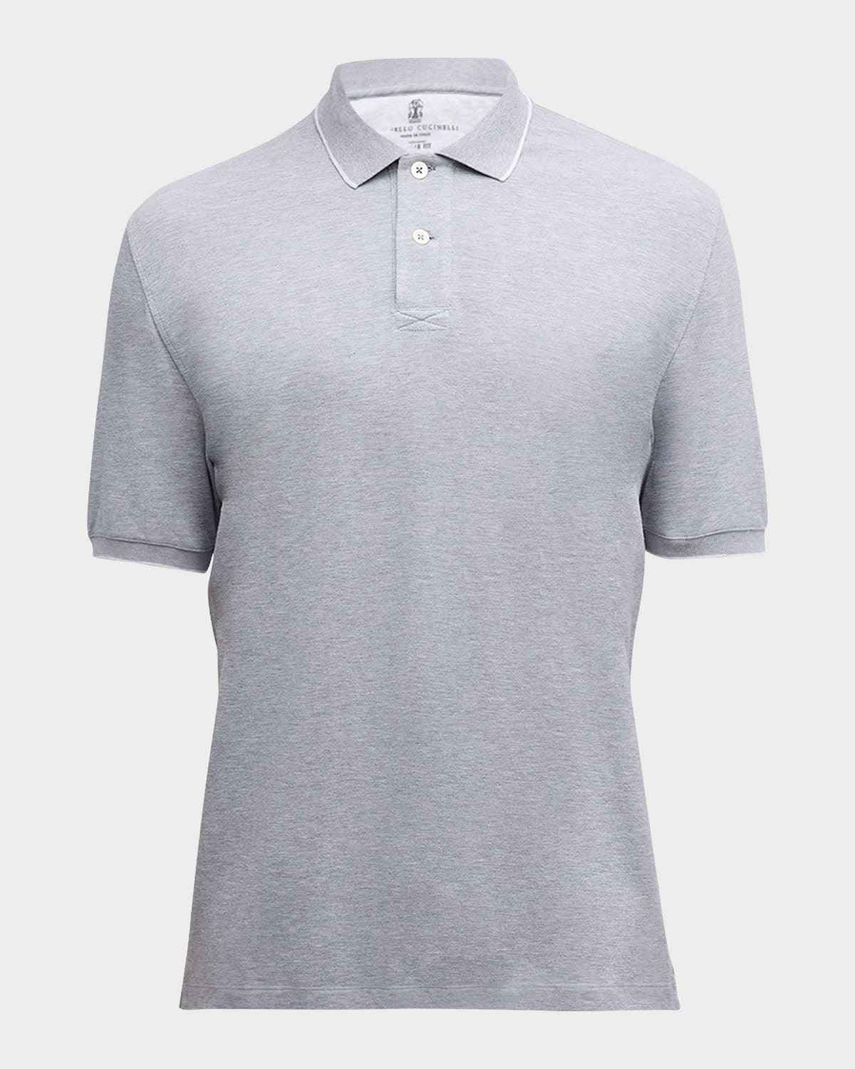 - Brunello Cucinelli polo shirt in solid cotton pique - Contrast tipping at collar and cuffs - Two-button placket - Short sleeves - Regular fit - Split hem - Pullover style - Made in Italy - Size Note: Height: 6'4"/ waist 32”/ ineam 34"/ chest 40/42L - Model is wearing size regular