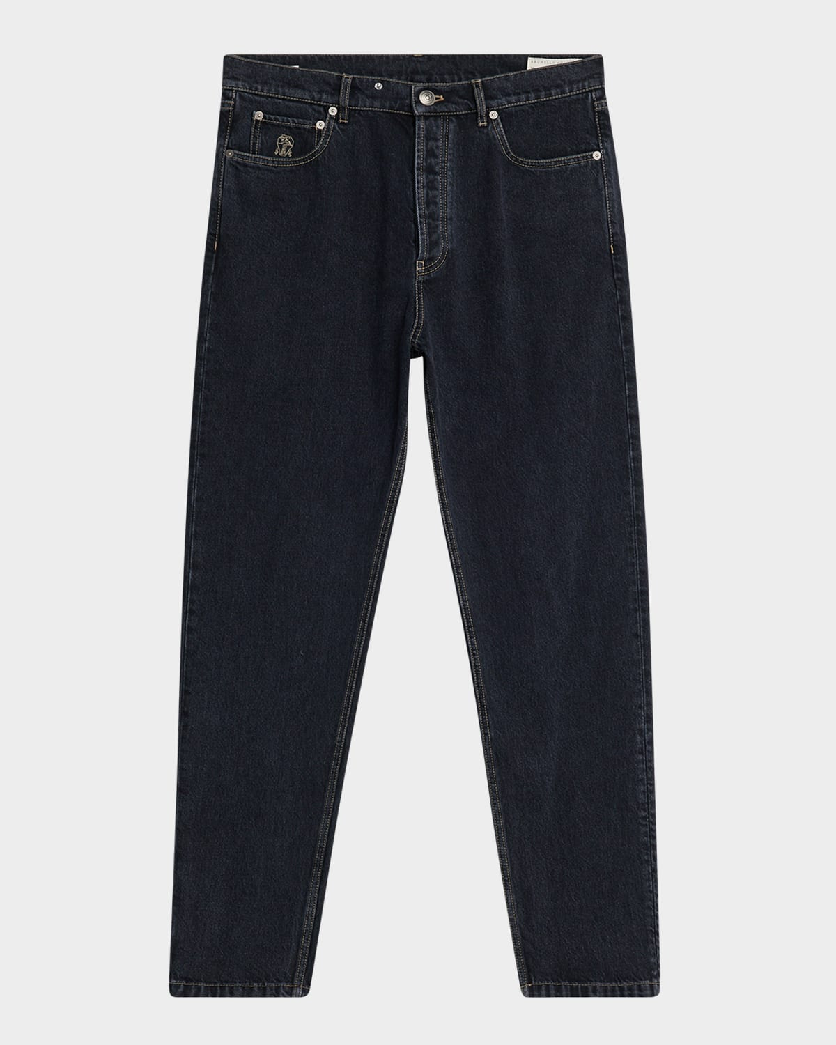 - Brunello Cucinelli jeans in dark denim revealing contrast stitching with the signature emblem on the ticket pocket - Regular rise - Five-pocket style - Back label - Classic fit through straight legs - Button-zip front; belt loops - Cotton - Dry clean, machine wash line dry - Made in Italy