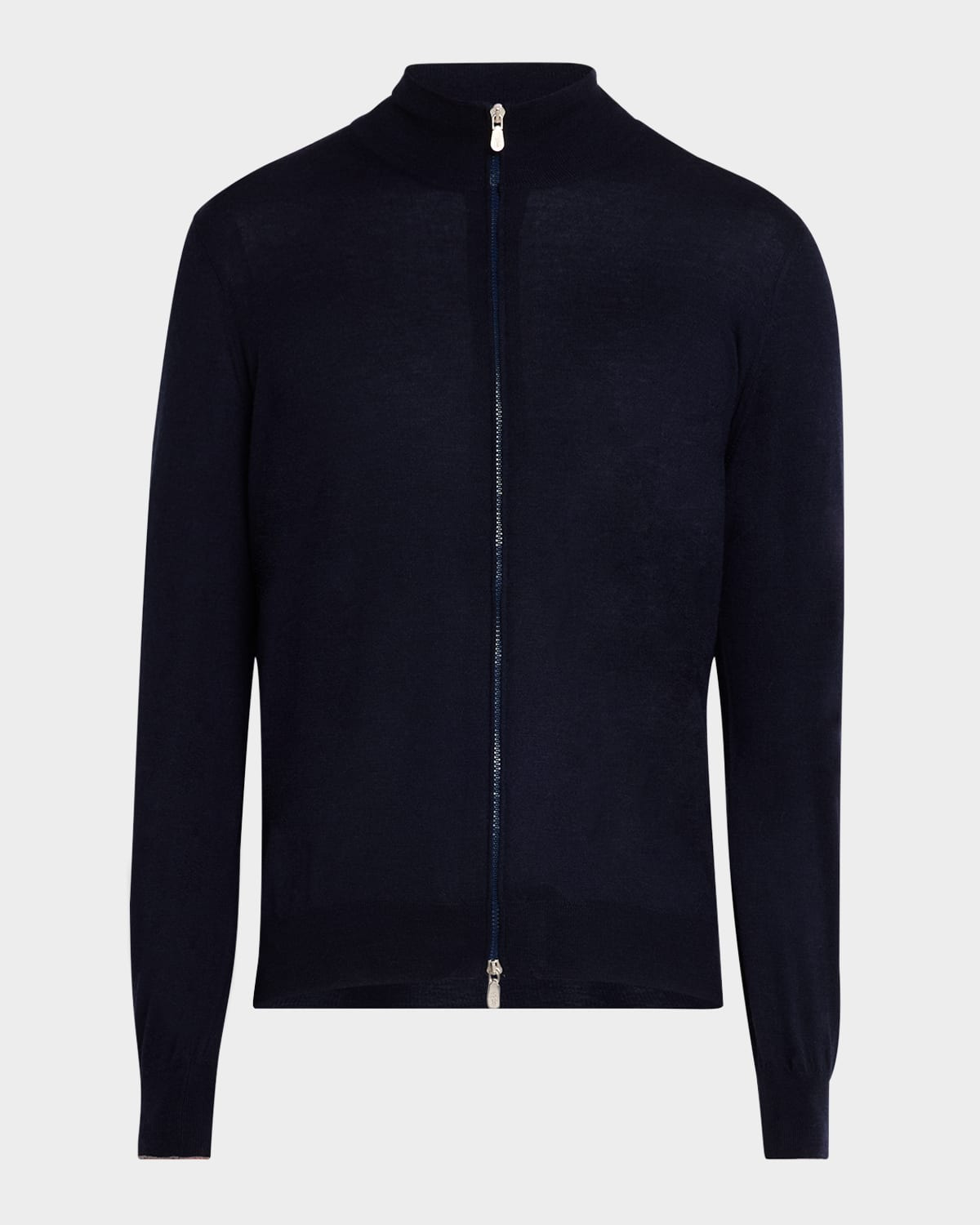 - Brunello Cucinelli sweater in fine gauge wool and cashmere - Ribbed mock neck - Long sleeves - Ribbed cuffs and hem - Virgin wool/cashmere - Unlined - Dry clean - Made in Italy - Model is 6'1"/185cm.
