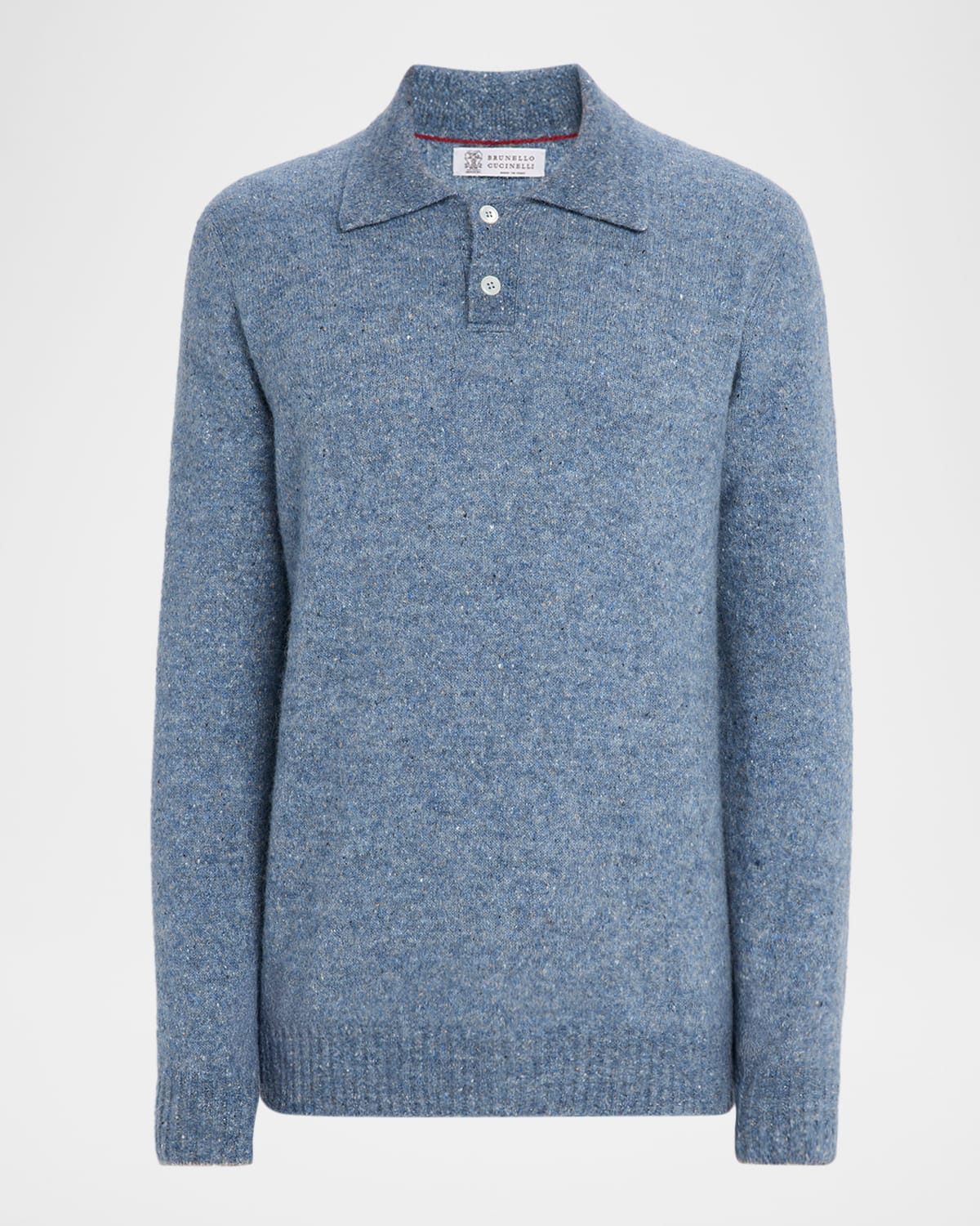 - Brunello Cucinelli polo sweater in a warm wool blend resulting in a melange finish - Spread collar - Two-button placket - Long sleeves - Ribbed cuffs and hem - Pullover style - Wool/nylon/polyamide - Made in Italy