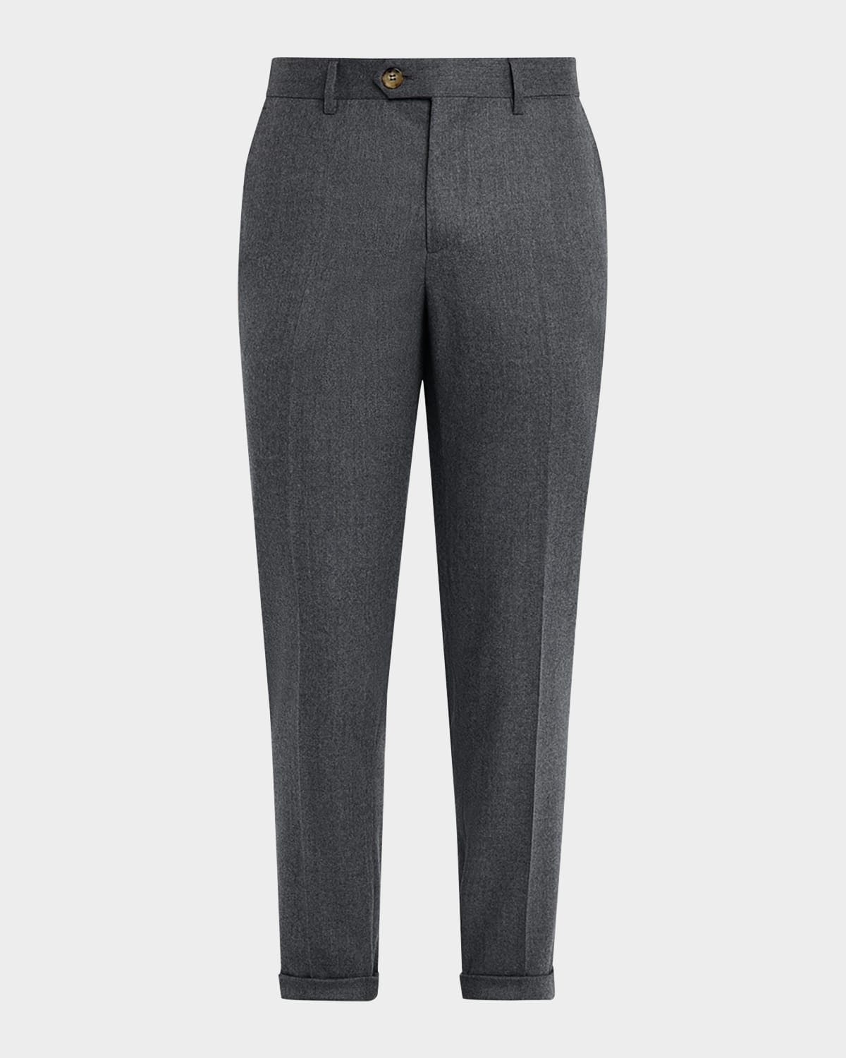 - Brunello Cucinelli dress pants in lightweight flannel for a comfortable finish - Regular rise - Flat front - Side slip pockets - Back besom pockets - Straight legs - Full length - Extended button-zip front; belt loops - Virgin wool - Lining: Acetate/cotton/cupro - Dry clean - Made in Italy