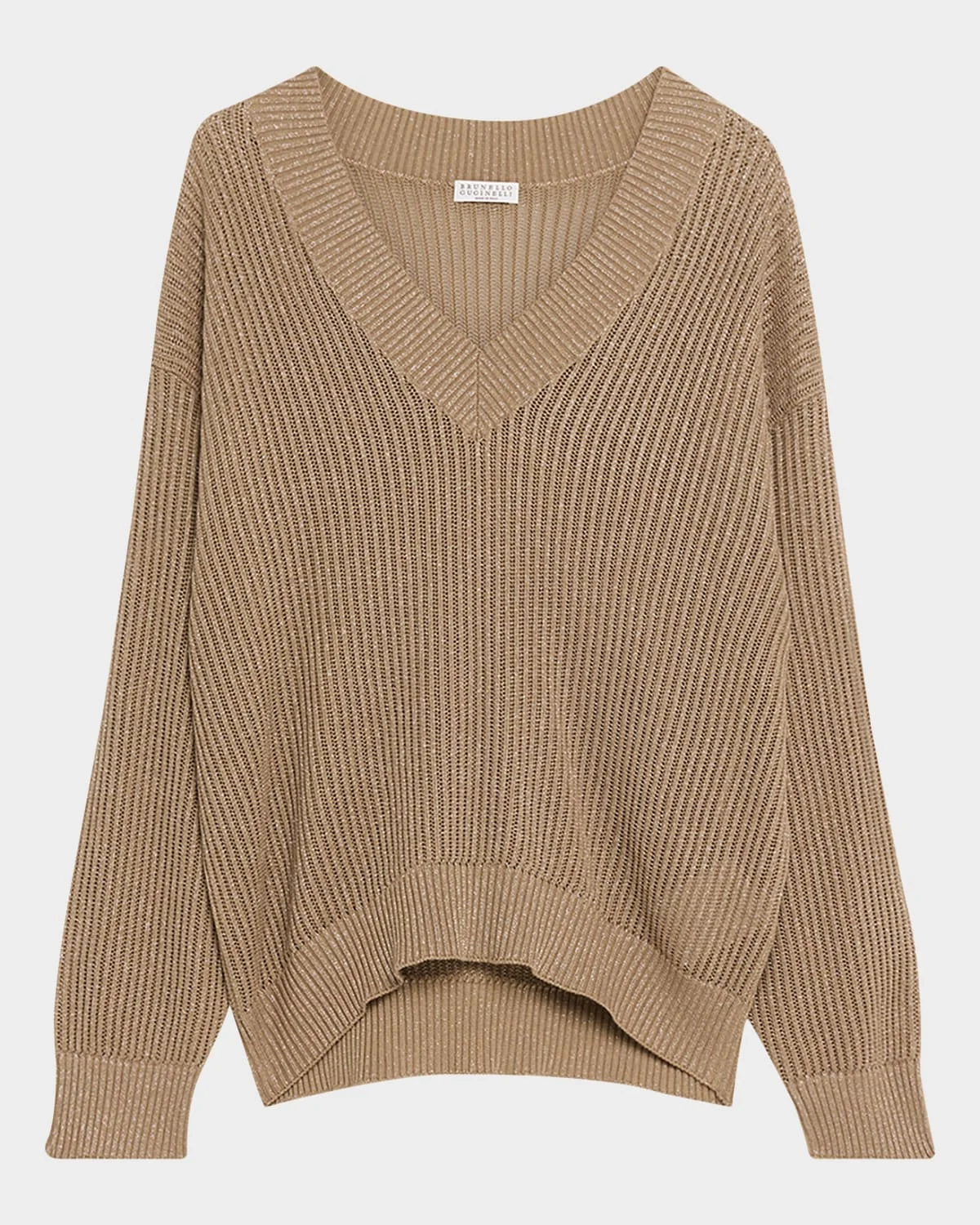 Brunello Cucinelli sweater is crafted of a metallic open ribbed knit V neckline Long sleeves Drop shoulders Loose fit Ribbed cuffs and hem Pullover style Cotton/viscose/metallic fibers Made in Italy