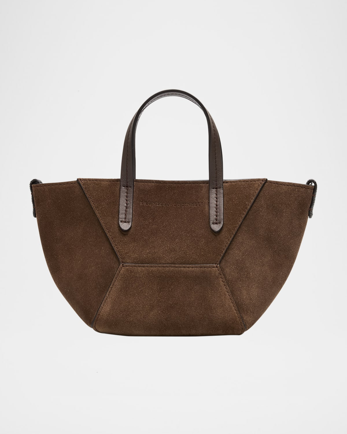 - Brunello Cucinelli "Geo" tote bag in suede - Top handles - Detachable, adjustable shoulder strap with monili trim - Can be worn as a top handle or shoulder bag - Open top with magnetic closure - Interior, one card slot - Approx. 5.5"H x 9.8"W x 3.9"D - Made in Italy