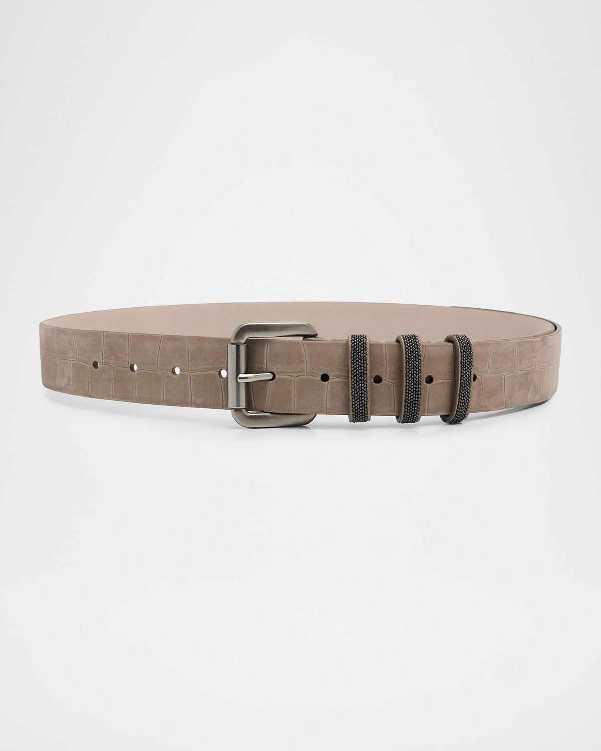 - Crafted of crocodile-effect leather, this Brunello Cucinelli wide belt enhances any ensemble with its blend of sophistication and craftsmanship. - Monili trimmed belt loops - Metal buckle - Leather/brass - Made in Italy