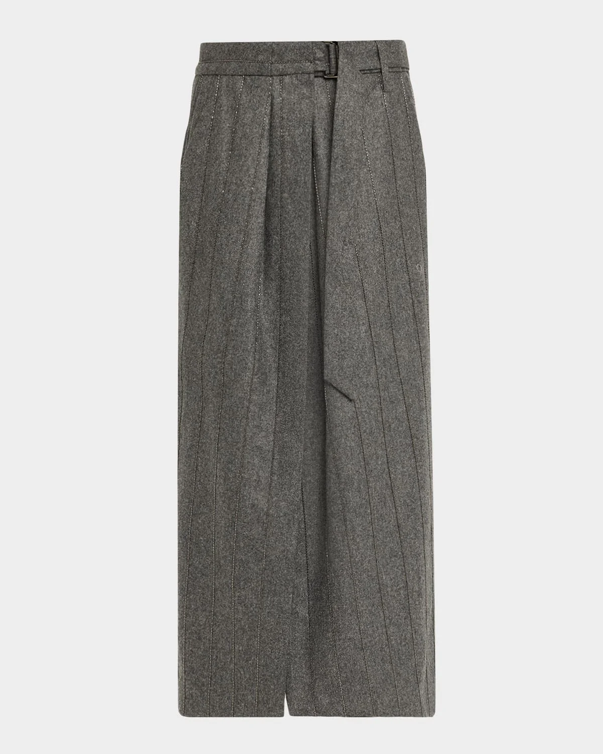Brunello Cucinelli wrap skirt crafted of a warm wool flannel, finished with pleats and monili pinstriped beading that shimmers with every step High waist Side split pockets Back welt pockets Skirt falls straight from hip to hem Anke length Belted closure; belt loops Virgin wool Lining: Silk/acetate Dry clean Made in Italy