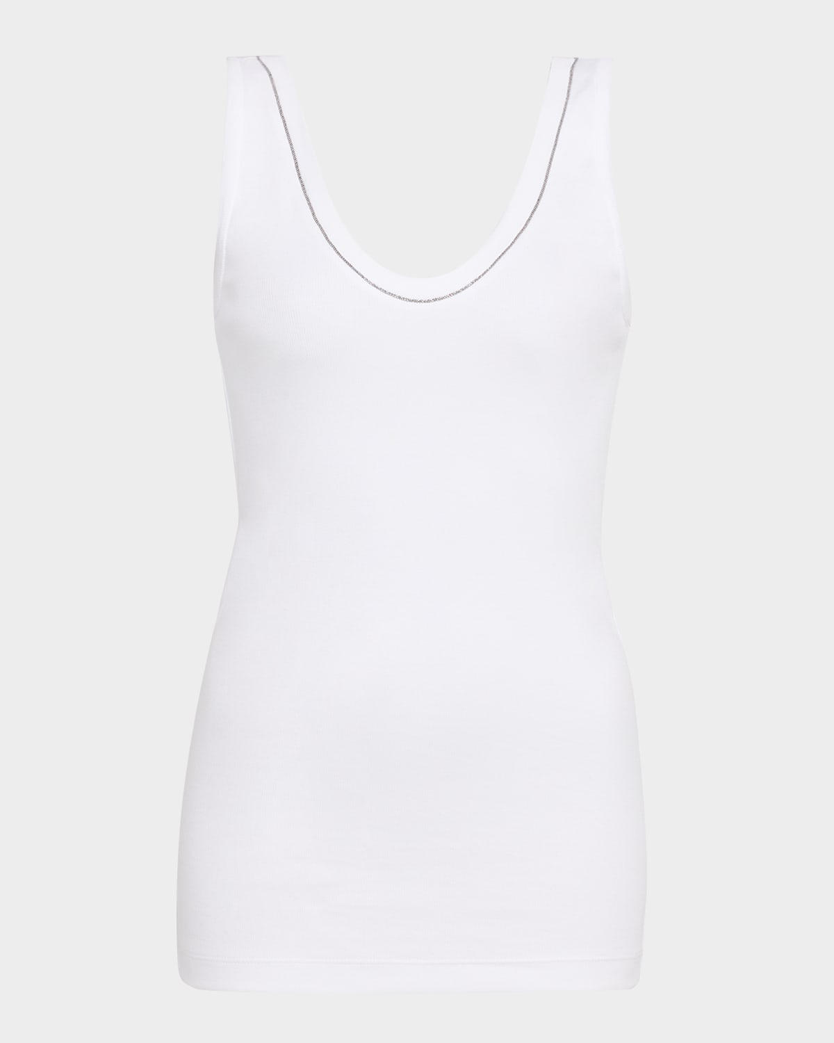- Brunello Cucinelli flat cotton rib tank top featuring monili embellished neckline - Scoop neckline - Sleeveless - Fitted - Pullover style - Cotton - Made in Italy
