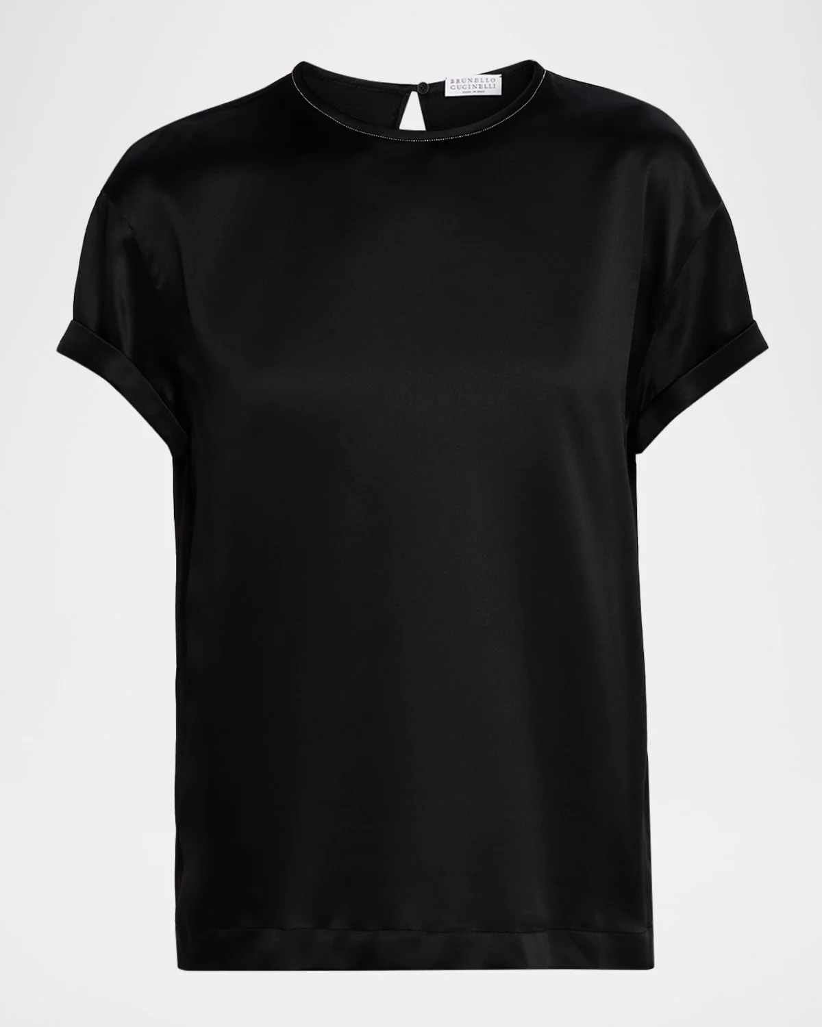 - A luminous essential, this Brunello Cucinelli T-shirt elevates a fluid stretch satin canvas with signature monili embellishments, offering timeless elegance and refined comfort in one effortlessly chic silhouette. - Crew neckline; button/keyhole back - Short sleeves - Rolled cuffs - Relaxed fit - Pullover style - Silk/elastane - Made in Italy