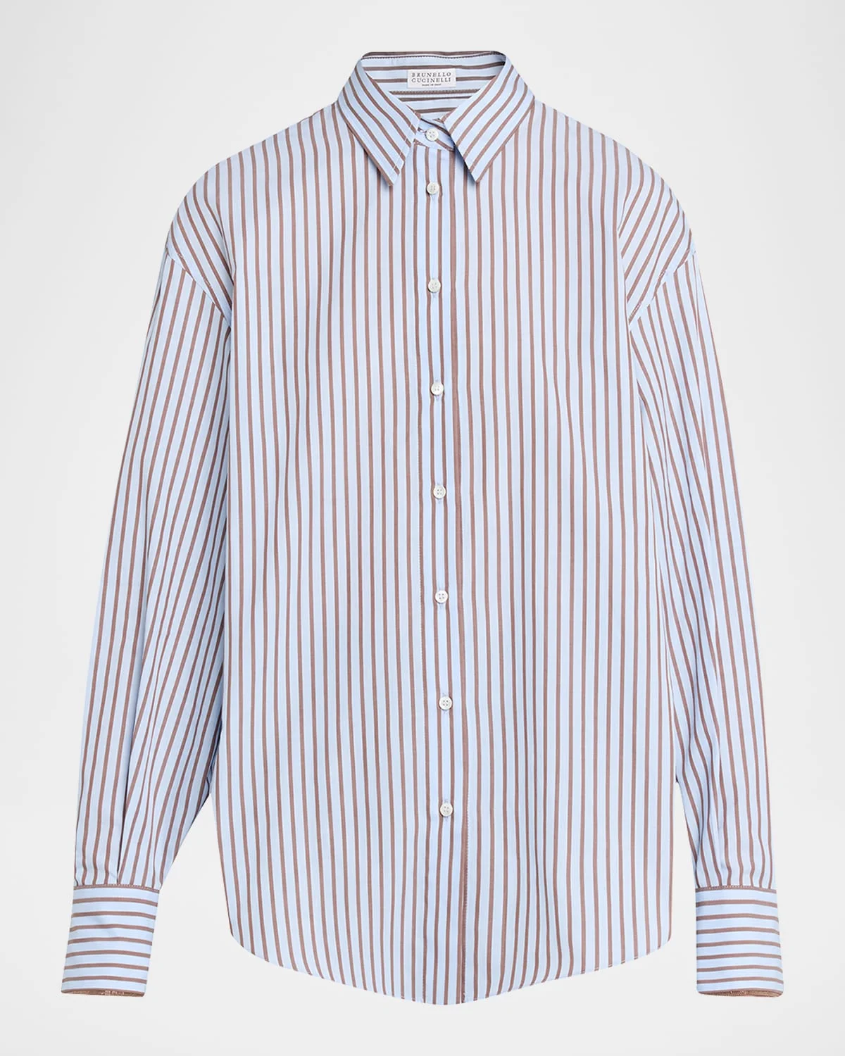 Crafted from crisp cotton poplin, this shirt from Brunello Cucinelli features a striped print and signature monili trim along the cuffs Point collar; button front Long sleeves; button cuffs Yoked back; box pleat Loose fit Shirttail hem Cotton Dry clean Made in Italy SIZE & FITModel measurements: 5 & apos;10" tallModel is wearing a US size 4/Small