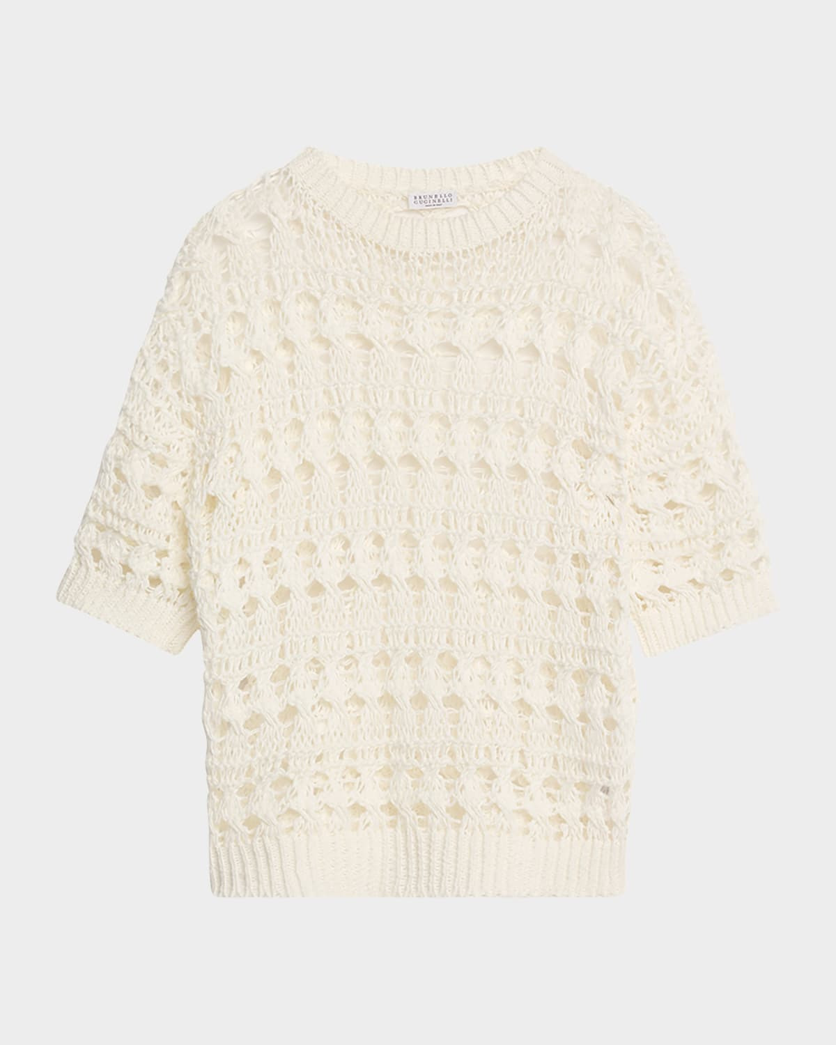 - Brunello Cucinelli jute openwork knit top - Crew neckline - Elbow-length sleeves - Relaxed fit - Pullover style - Jute/cotton/nylon/polyamide - Made in Italy
