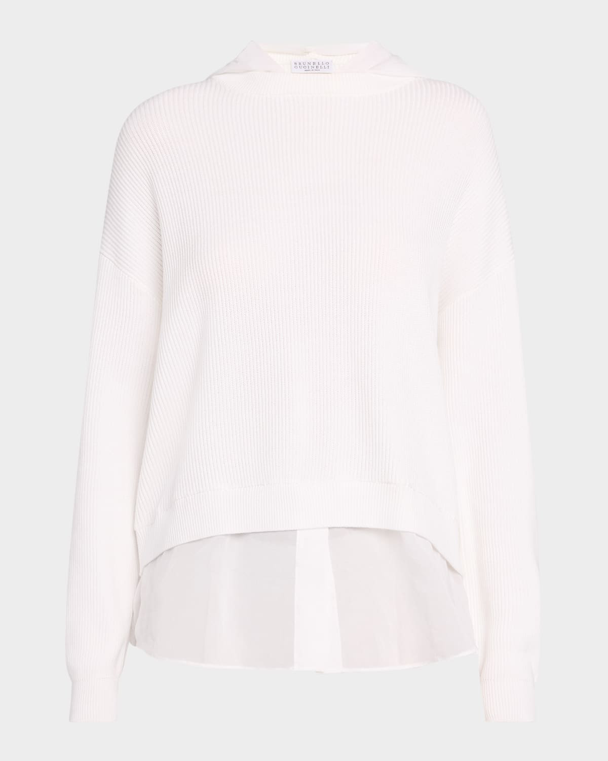 Brunello Cucinelli shirt in ribbed knit and organza combo Hooded neckline Long sleeves; ribbed cuffs Shirttail hem Pullover style Cotton Made in Italy