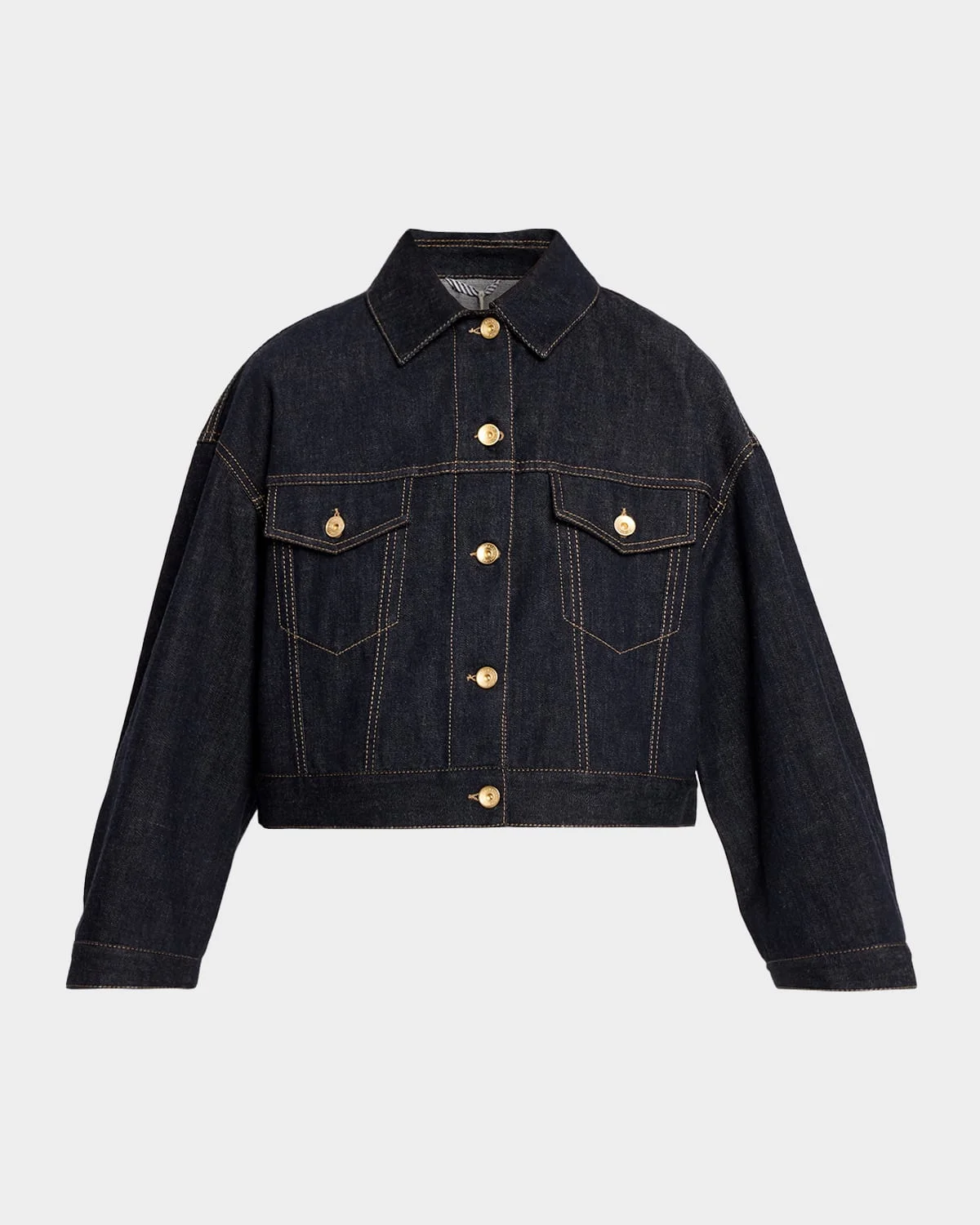 Crafted from dark-washed denim, this jacket from Brunello Cucinelli features a boxy silhouette with contrast topstitching Point collar; single-breasted front Long sleeves; button cuffs Chest button-flap pockets Oversized boxy silhouette Cropped length Button-tab hem Button closure Cotton Dry clean Made in Italy