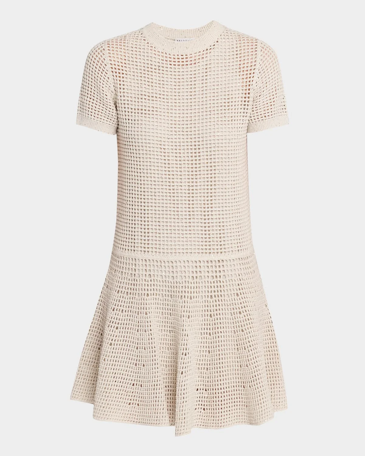 Crafted from paillette linen-blend open knit, this dress from Brunello Cucinelli features a drop waist leading to a flounce skirt Round neckline Short sleeves; ribbed cuffs Drop waist Shift silhouette Mini length Slipover style Cotton/polyester Lining: Acetate/silk Made in Italy
