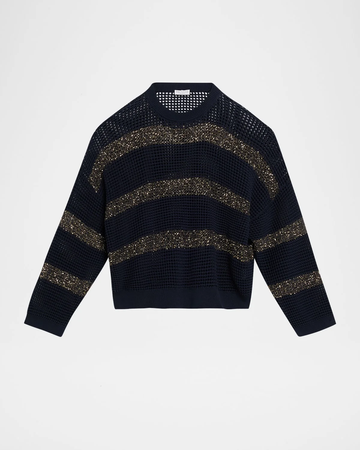 Brunello Cucinelli sweater is crafted of an open knit with water reflection-effect & nbsp;paillette stripes Crew neckline Long sleeves Drop shoulders Oversized fit Ribbed cuffs and hem Pullover style Cotton/nylon/polyamide/polyester Made in Italy
