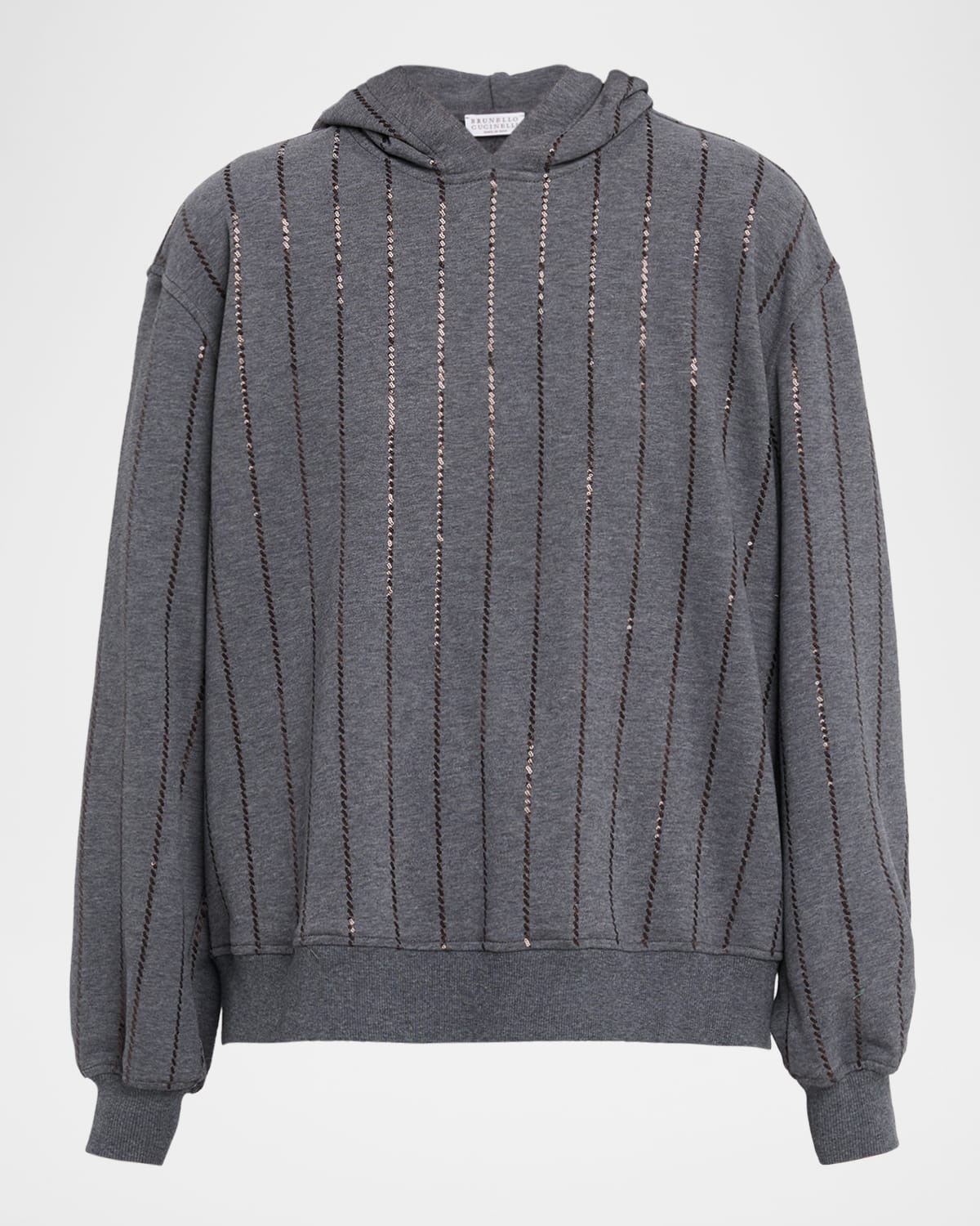 - Paillette vertical stripes signal a sporty vibe to this hooded Brunello Cucinelli sweatshirt, where casual comfort makes an of-the-moment call for opulence - Hooded neckline - Long sleeves - Relaxed fit - Ribbed cuffs and hem - Pullover style - Cotton/elastane - Made in Italy
