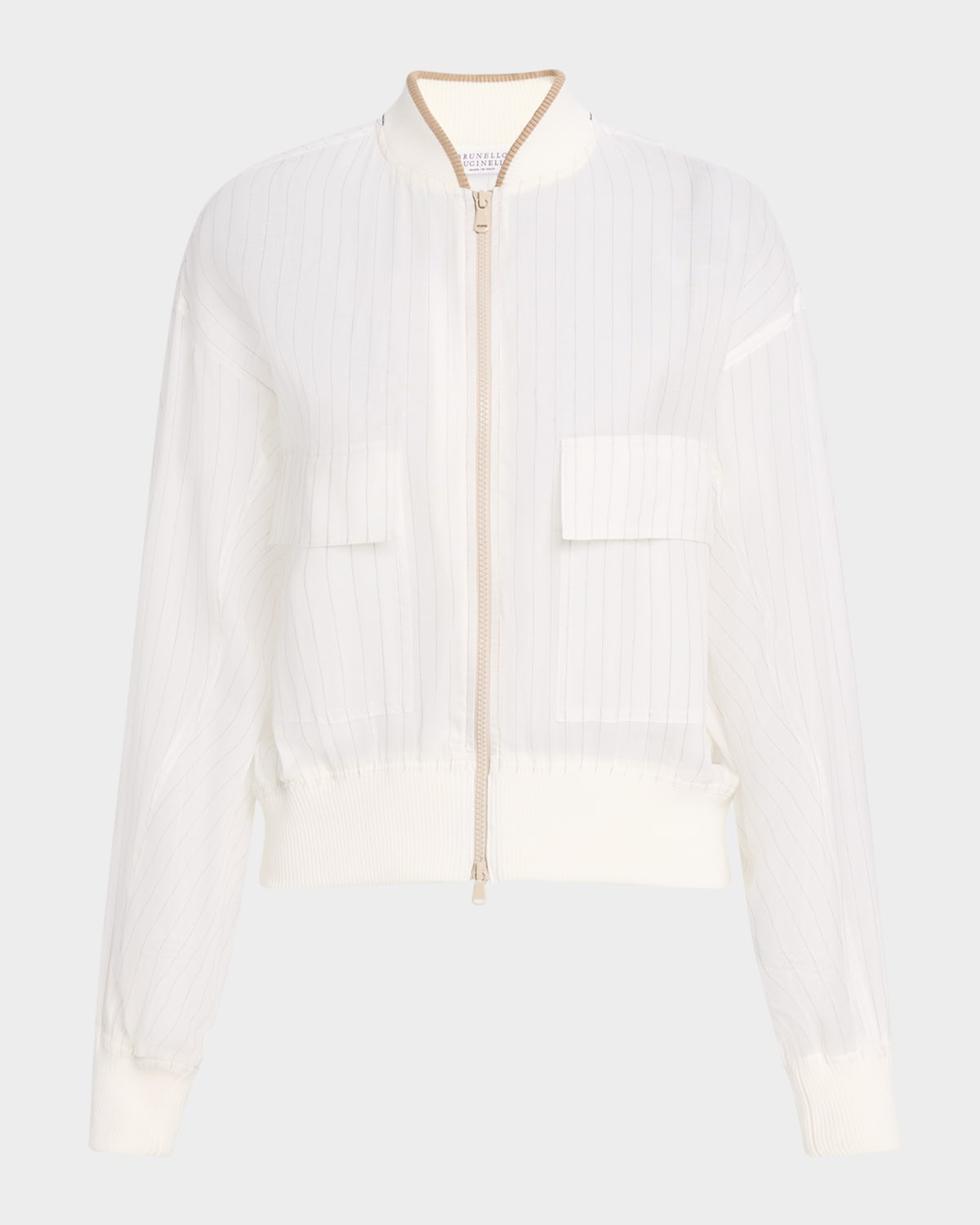 - Brunello Cucinelli cotton gauze bomber jacket featuring a pinstriped print and monili trim on the back of the neck - Baseball collar; two-way zip front - Long sleeves - Chest flap pockets - Relaxed fit - Ribbed cuffs and hem - Cotton - Made in Italy