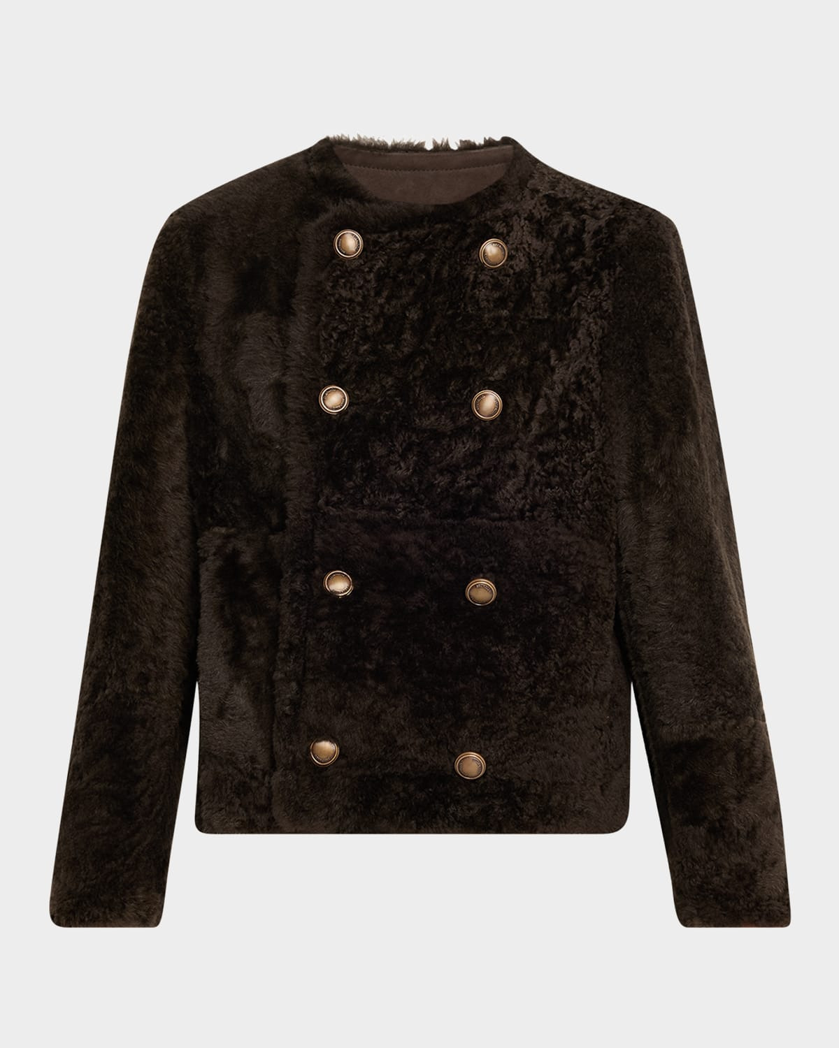- Brunello Cucinelli reversible jacket in natural and dyed soft sheep shearling (France) - Round neckline; double-breasted front - Long sleeves - Hip slip pockets - Straight fit - Hip length - Shearling - Lining: Acetate/polyester - Dry clean - Made in Italy