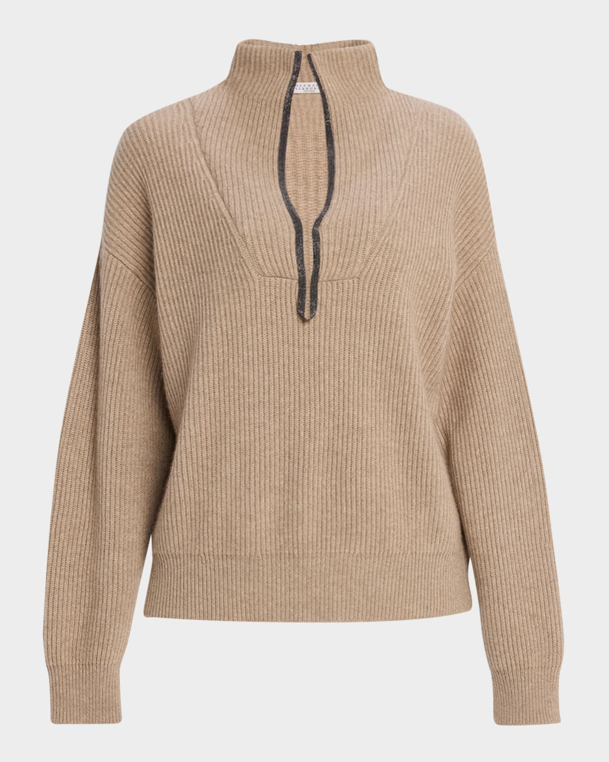 - Brunello Cucinelli ribbed cashmere pullover featuring signature monili trim - Deep V neckline; stand collar - Dropped shoulders - Long sleeves - Relaxed fit - Hem falls to the hip - Pullover style - Cashmere - Made in Italy