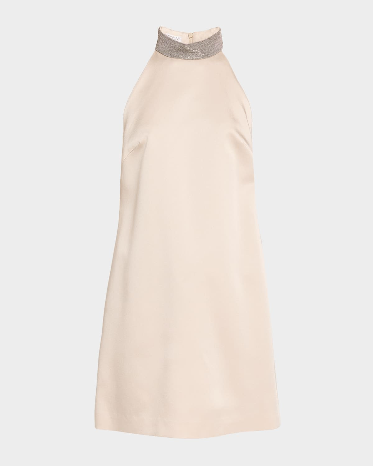 - Crafted from a satin Cady, this Brunello Cucinelli mini dress is embellished with signature monili trim. - Halter neckline - Sleeveless - A-line silhouette - Hem falls above the knee - Center back zip - Acetate/viscose - Lining: Silk/acetate - Dry clean - Made in Italy