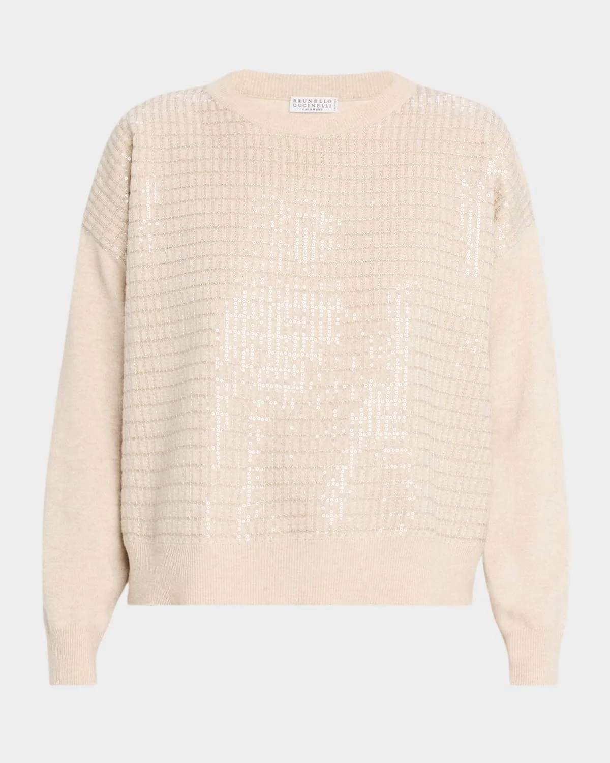 Crafted from soft cashmere-blend knit, this sweater from Brunello Cucinelli shimmers with sequins embroidered in a check motif Crew neckline Long sleeves Drop shoulders Relaxed fit Hip length Ribbed cuffs and hem Pullover style Cashmere/wool/silk Dry clean Made in Italy SIZE & FITModel measurements: 5 & apos;10" tallModel is wearing a US size 4/Small