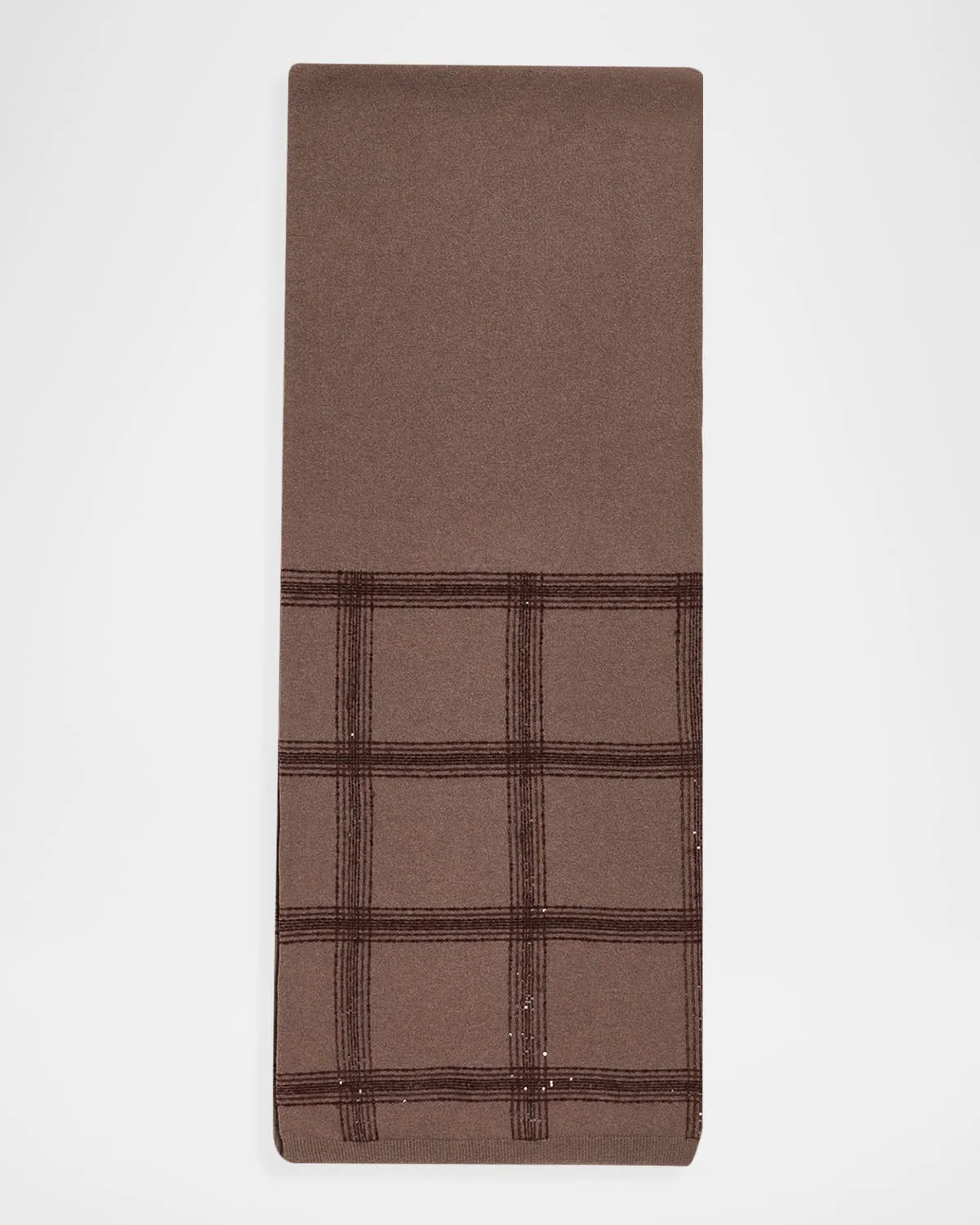 Brunello Cucinelli scarf shimmers with a sequined check pattern. Crafted from a luxe blend of wool and cashmere, it envelops the body with warmth. May be styled multiple ways Wool/cashmere/polyester Spot clean Imported