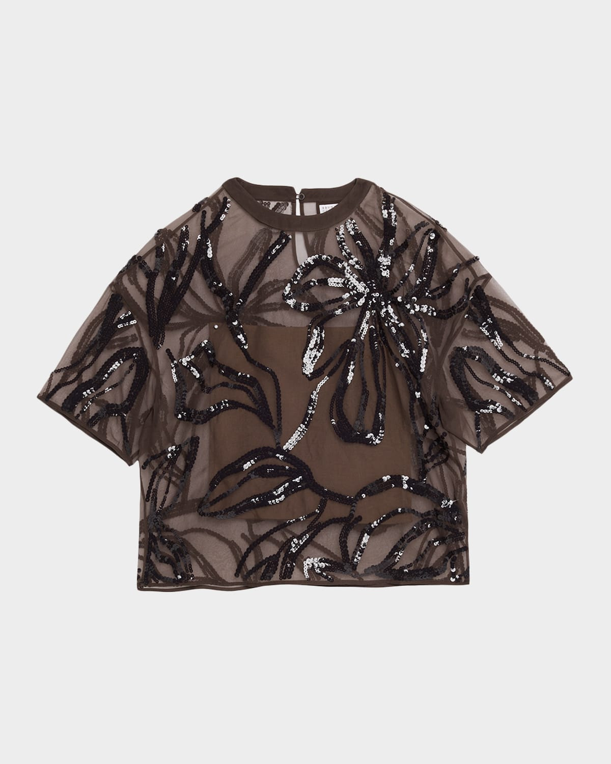 Detailed with sparkling, tonal sequinembellished florals, this blouse by Brunello Cucinelli is crafted from ultrafine, crispy silk chiffon for a transparent, matte finish Crew neckline Short sleeves Relaxed fit Hip length Silk Made in Italy