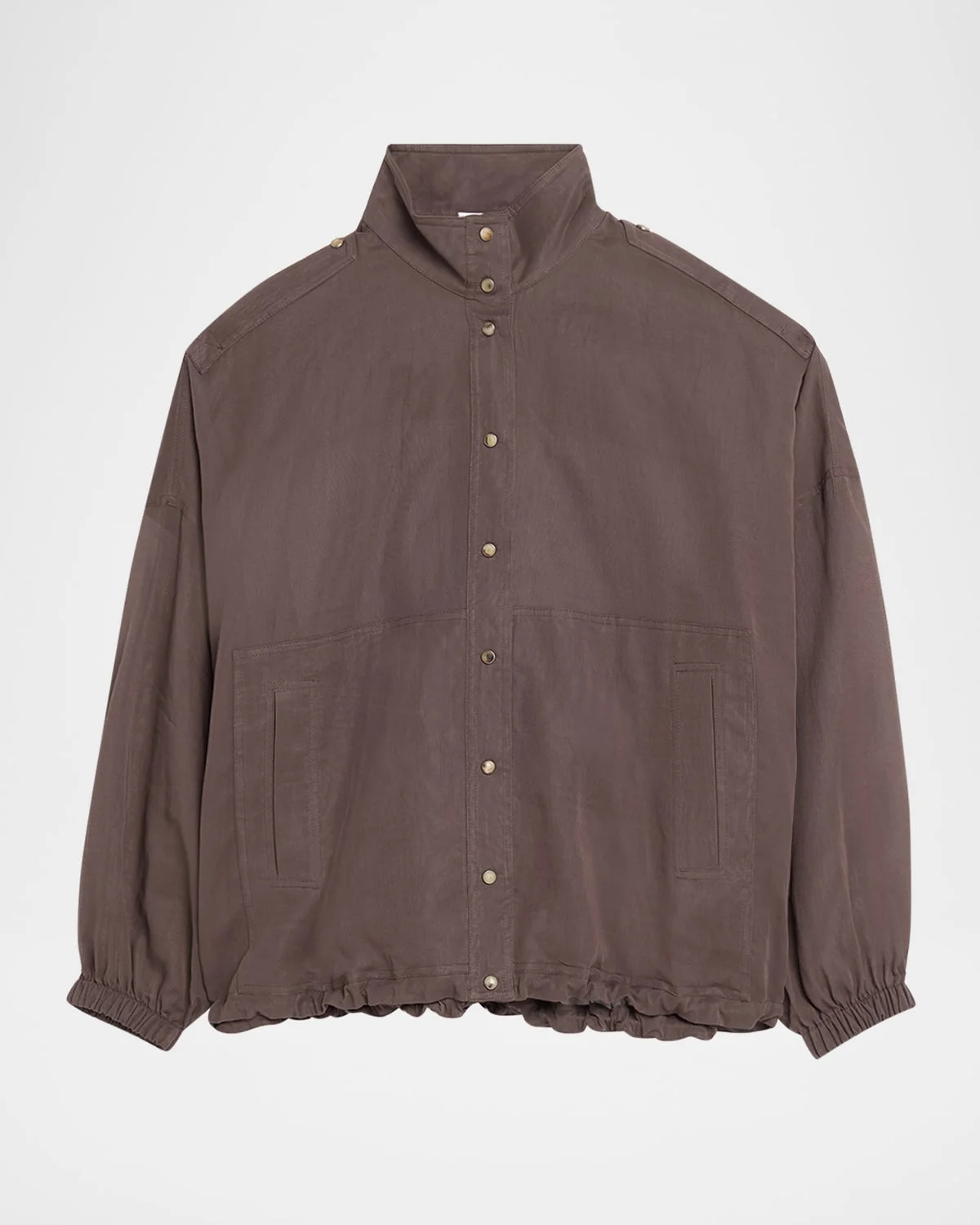 Crafted from sheer cotton voile, this bomber jacket from Brunello Cucinelli features an oversized silhouette and elasticized cuffs and hem Stand collar; single-breasted front Long sleeves Drop shoulders Hip welt pockets Hip length Elasticized cuffs and hem Snap button closure Cotton Dry clean Made in Italy
