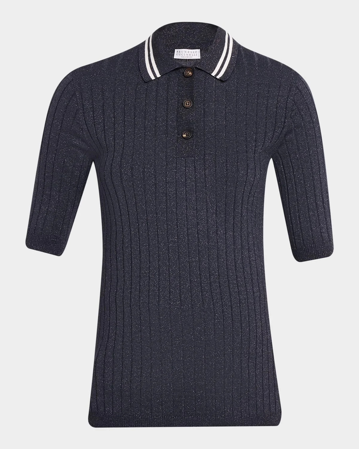 Crafted from shimmering light cashmere rib, this polo sweater & nbsp;from Brunello Cucinelli features a striped collar and buffalo horn buttons Point collar; three-button front Short sleeves Slim fit Hip length Ribbed cuffs and hem Pullover style Cashmere/silk/nylon/polyamide Dry clean Made in Italy SIZE & FITModel measurements: 5 & apos;10" tallModel is wearing a US size 4/Small