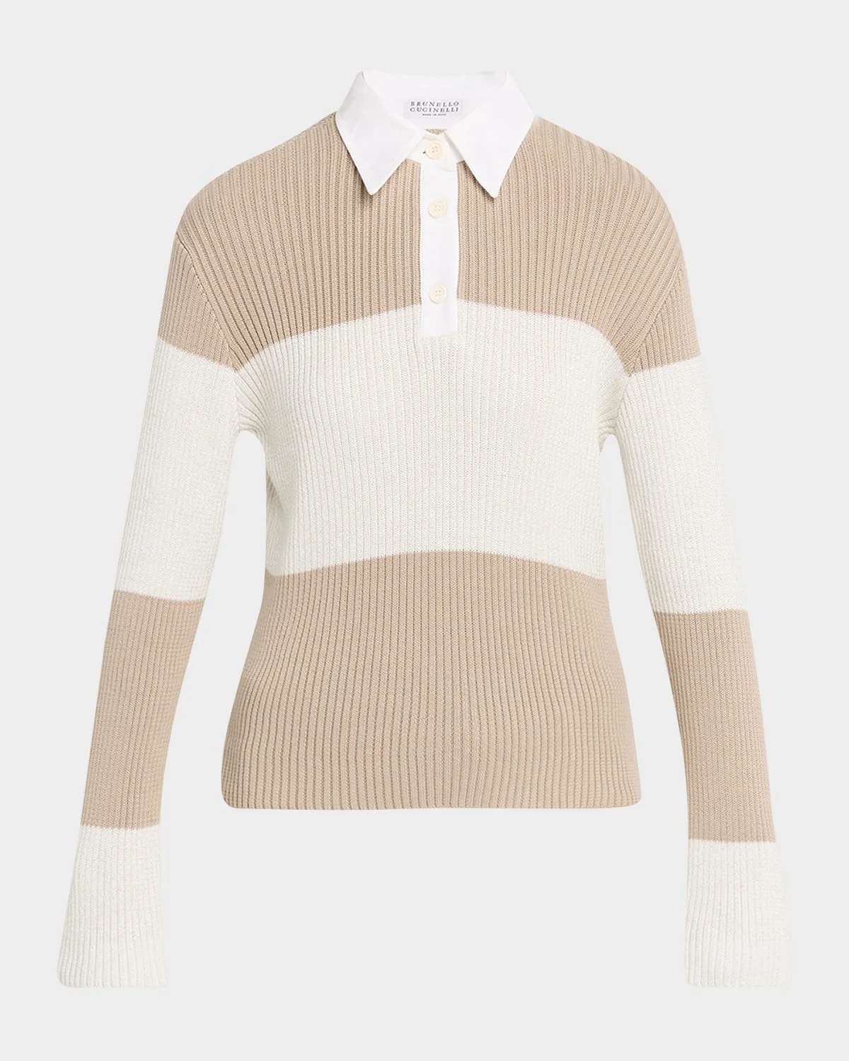 Crafted from cotton ribbed knit, this polo sweater from Brunello Cucinelli features a shimmering striped intarsia and a contrast crisp cotton poplin collar and blacket Spread collar; three-button front Long sleeves Drop shoulders Relaxed fit Hip length Pullover style Cotton/viscose/metallic fibers Dry clean Made in Italy SIZE & FITModel measurements: 5 & apos;10" tallModel is wearing a US size 4/Small